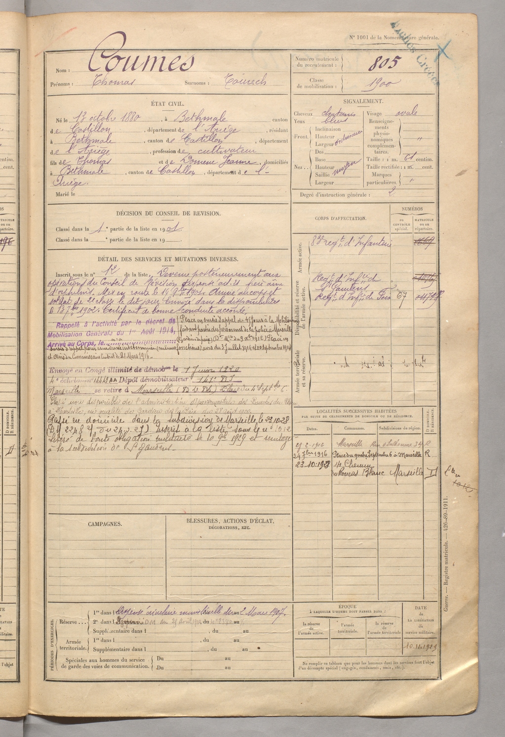 | Coumes | Thomas dit Tourech | FOIX | 129 W 5 | 1900 | Bethmale | Bethmale | 805 |
