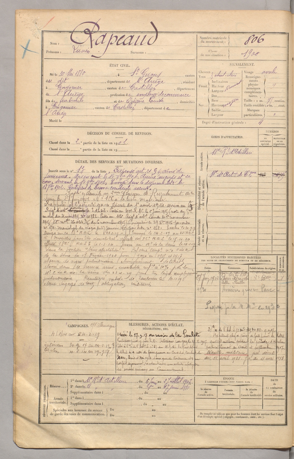 | Rapeaud | Lucien | FOIX | 129 W 5 | 1900 | Saint-Girons | Engomer | 806 |
