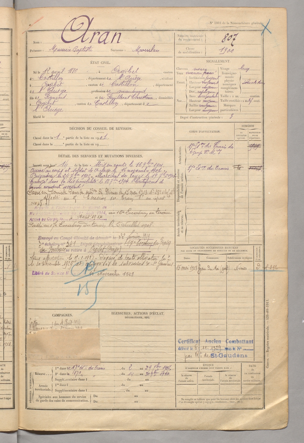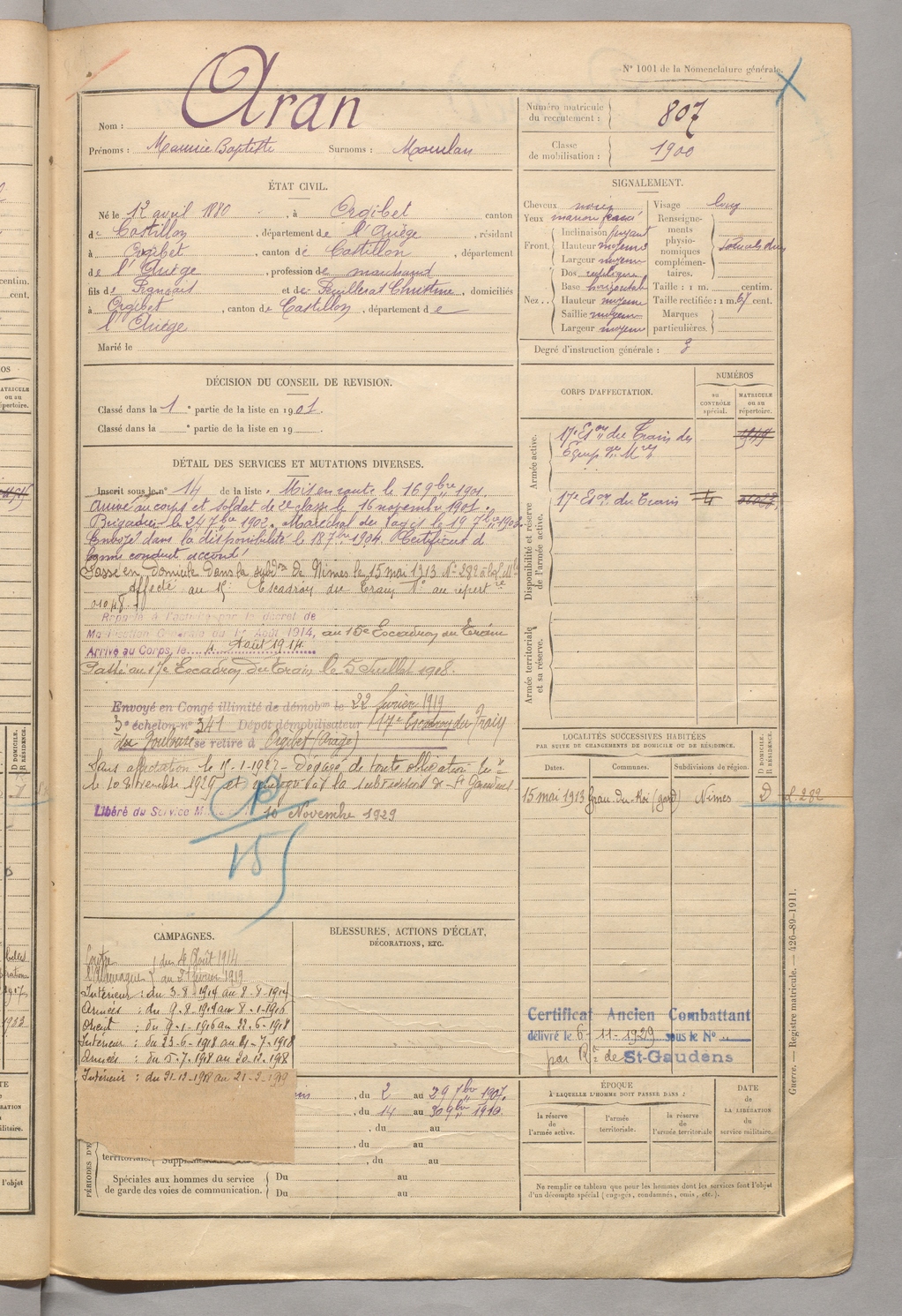 | Aran | Maurice Baptiste dit Mouclan | FOIX | 129 W 5 | 1900 | Orgibet | Orgibet | 807 |