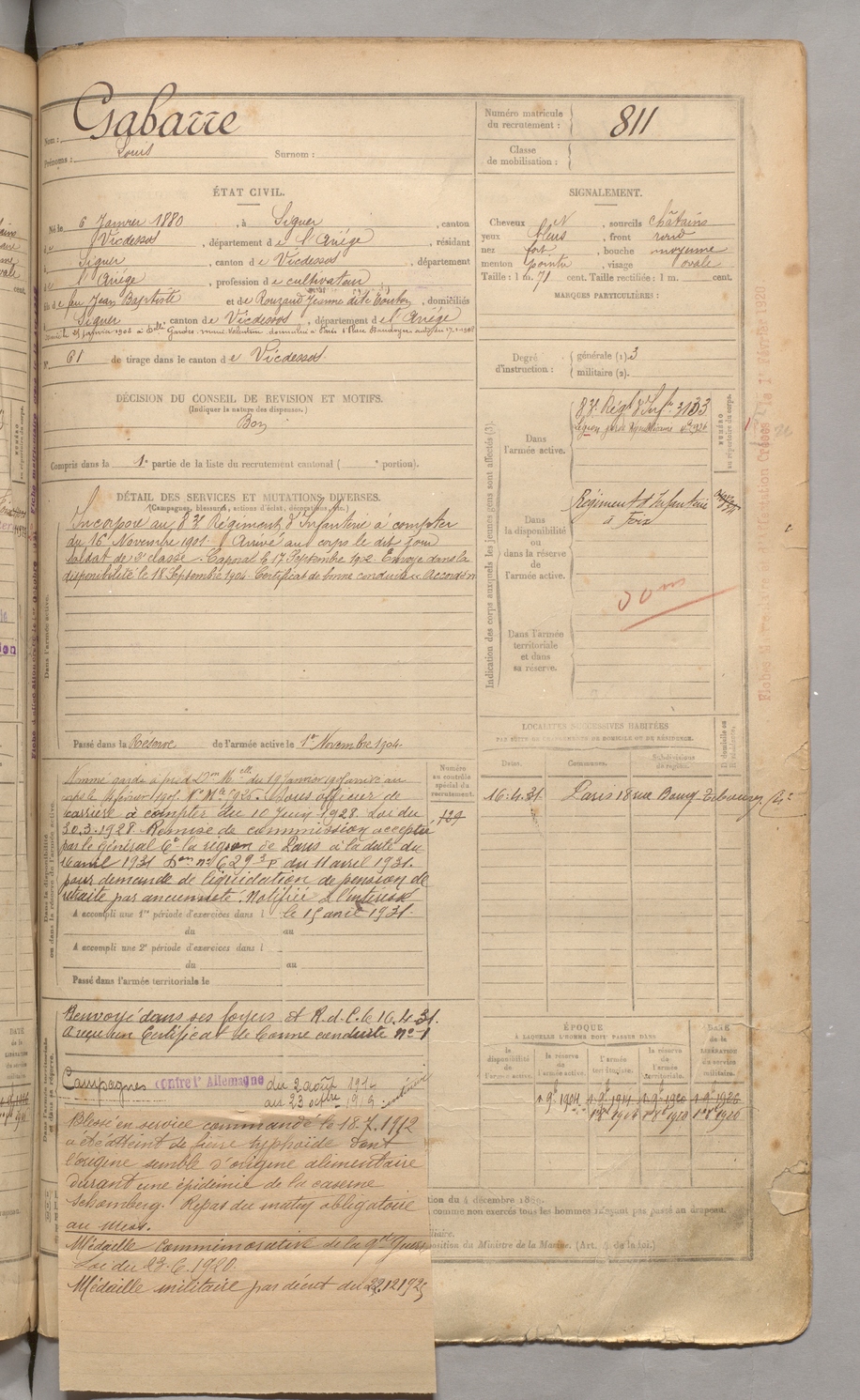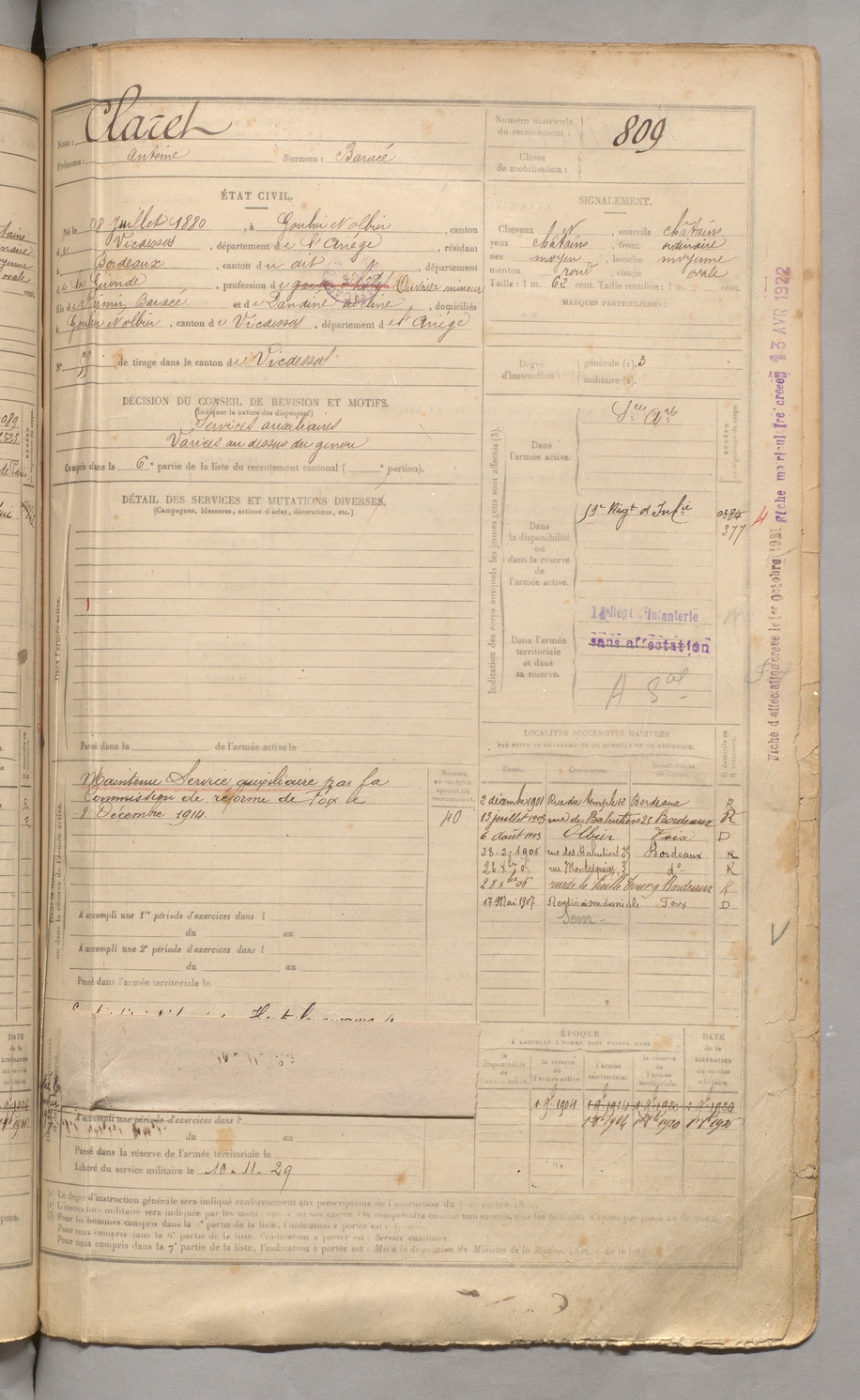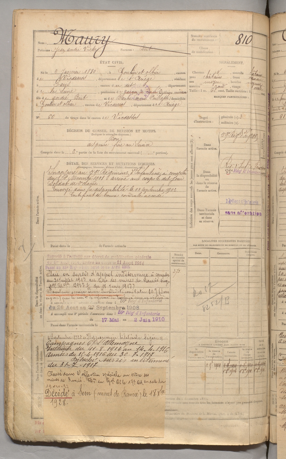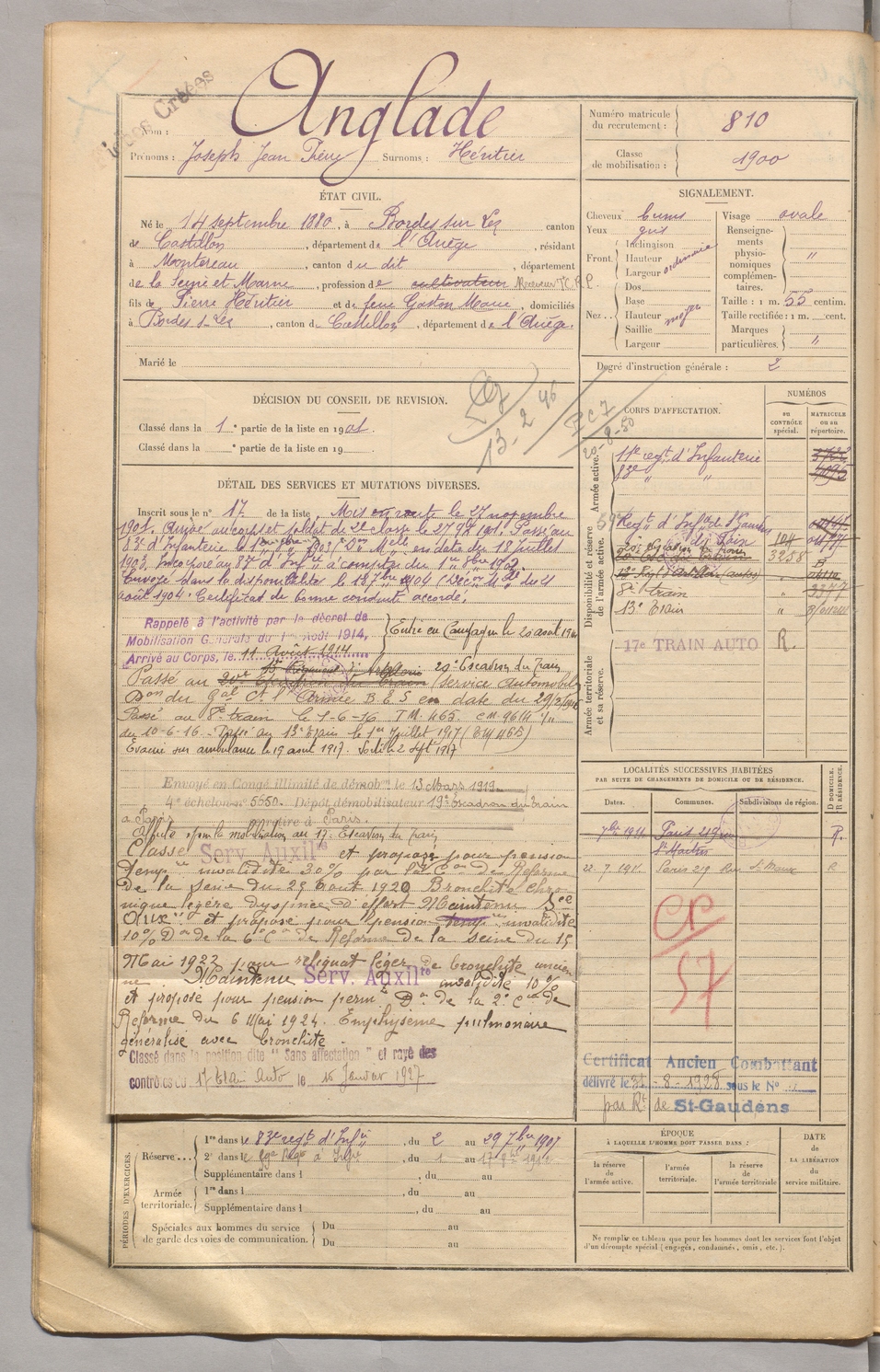 | Anglade | Joseph Jean Pierre dit Héritier | FOIX | 129 W 5 | 1900 | Bordes-sur-Lez | Montereau | 810 |