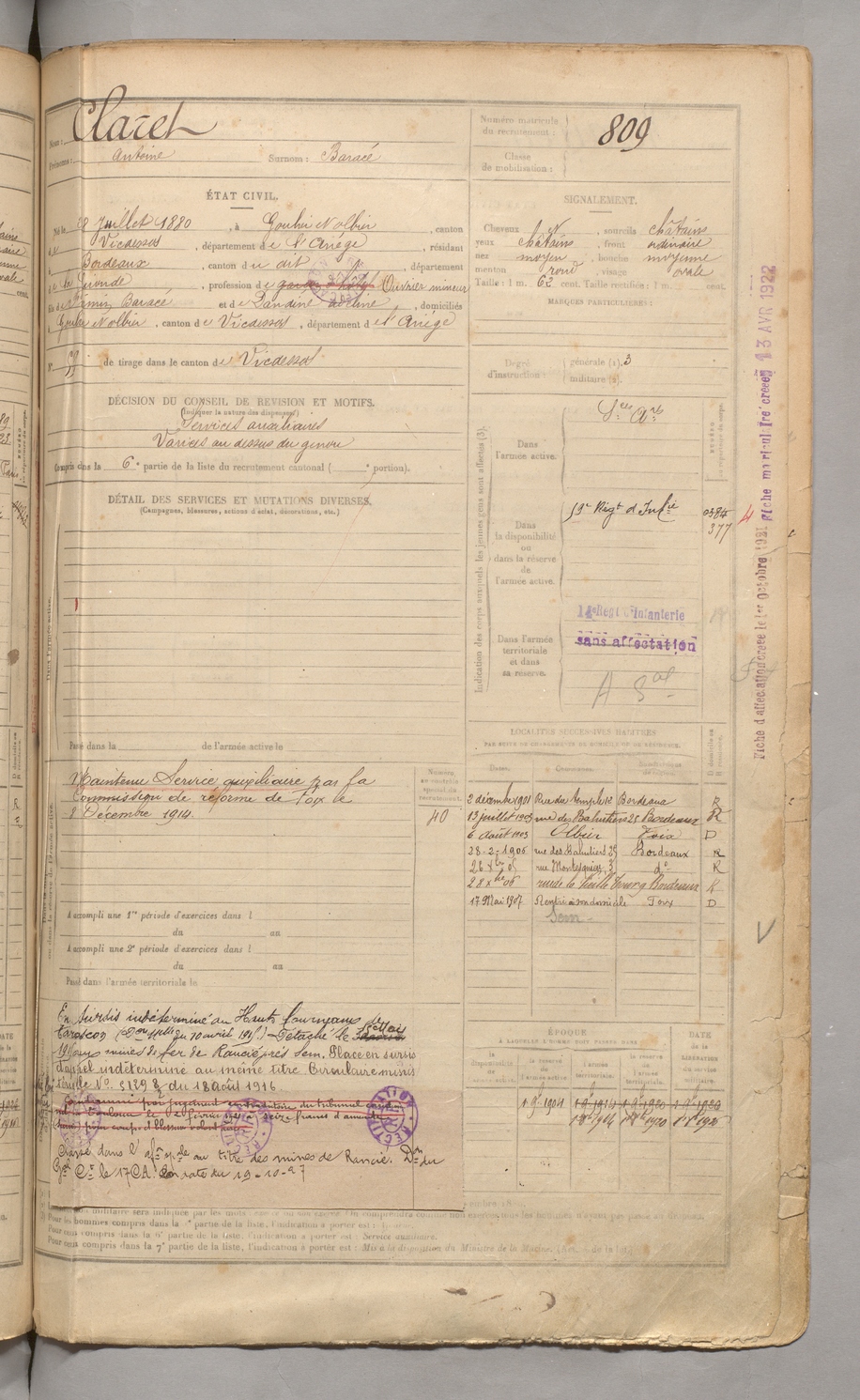 | Claret | Antoine dit Baracé | FOIX | 129 W 3 | 1900 | Goulier-Olbier | Bordeaux | 809 |