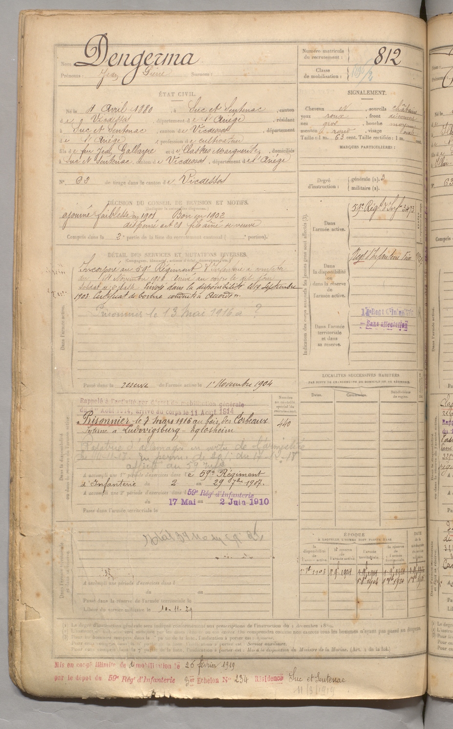| Dengerma | Jean Pierre | FOIX | 129 W 3 | 1900 | Suc-et-Sentenac | Suc-et-Sentenac | 812 |