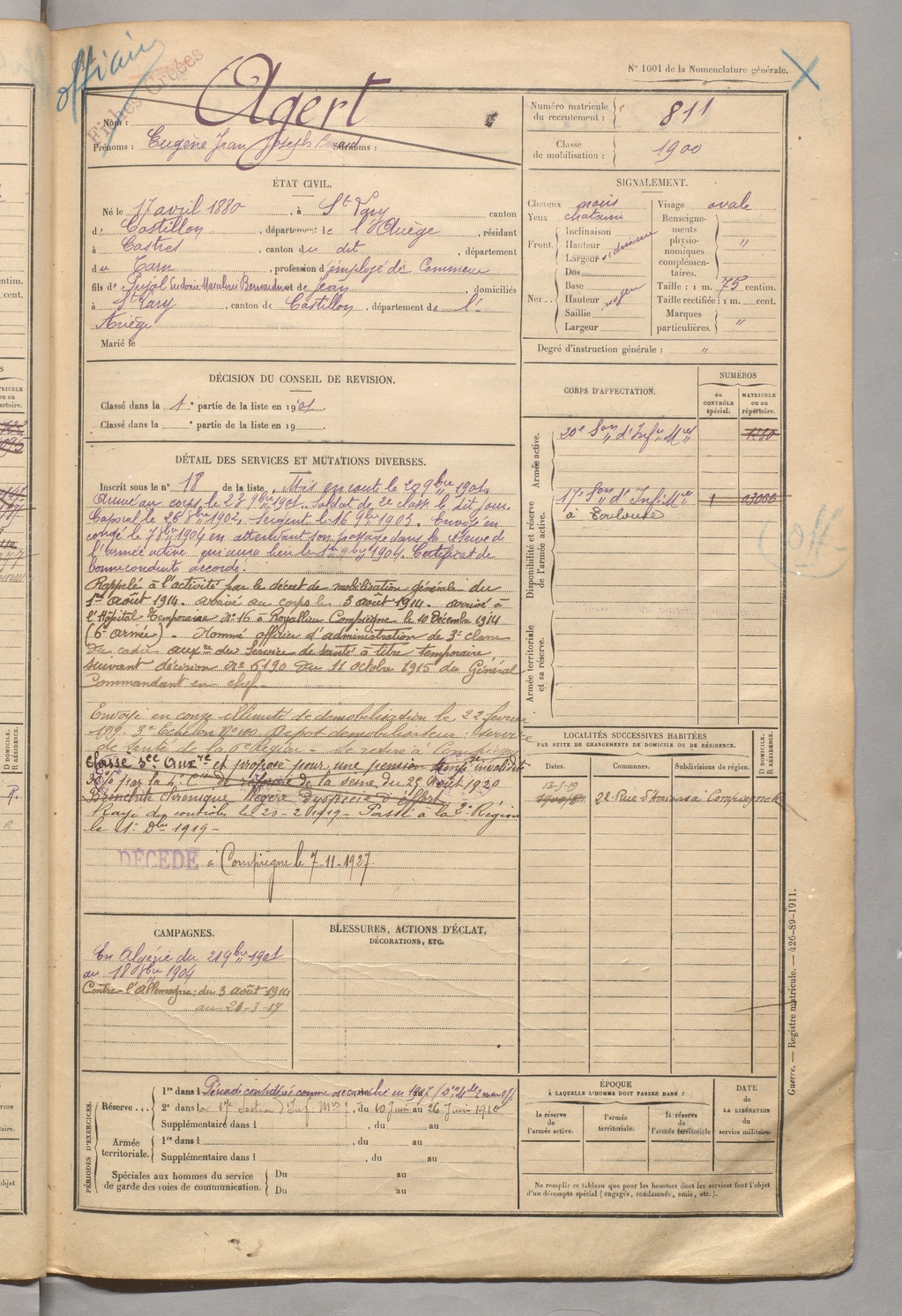 | Agert | Eugène Jean Joseph Bernard | FOIX | 129 W 5 | 1900 | Saint-Lary | Castres | 811 |