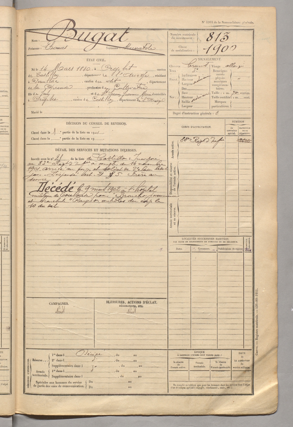 | Bugat | Thomas dit Bernatoli | FOIX | 129 W 5 | 1900 | Orgibet | Pauillac | 813 |