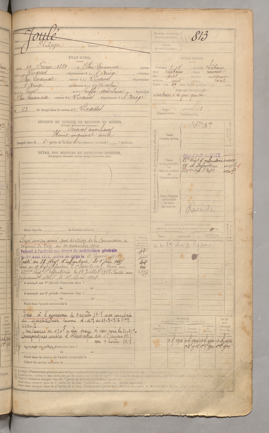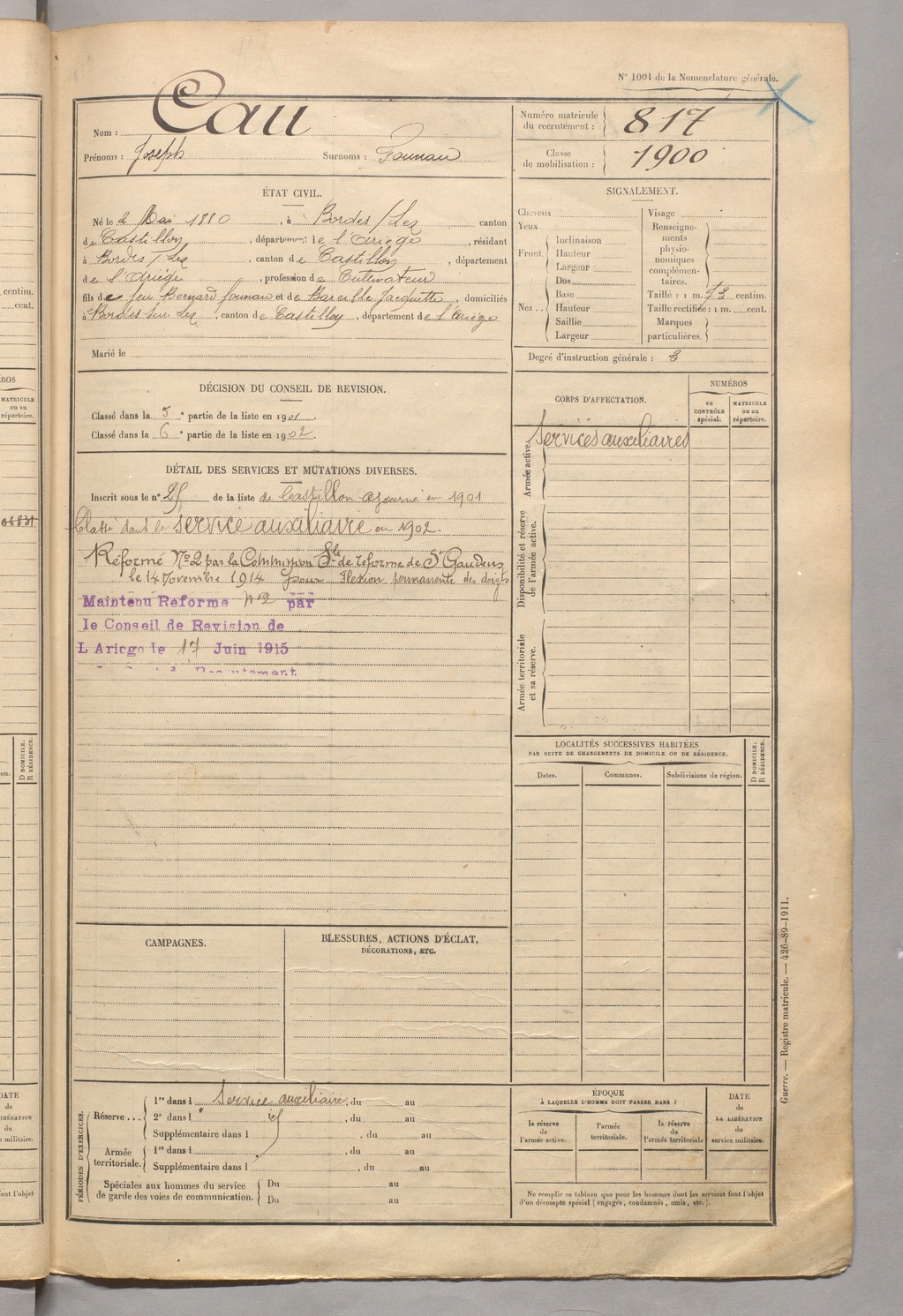 | Cau | Joseph dit Founau | FOIX | 129 W 5 | 1900 | Bordes-sur-Lez | Bordes-sur-Lez | 817 |