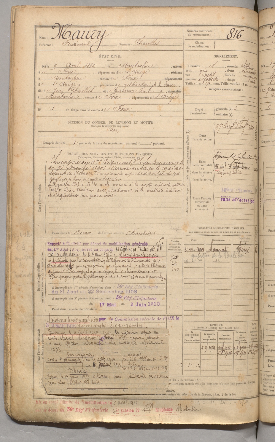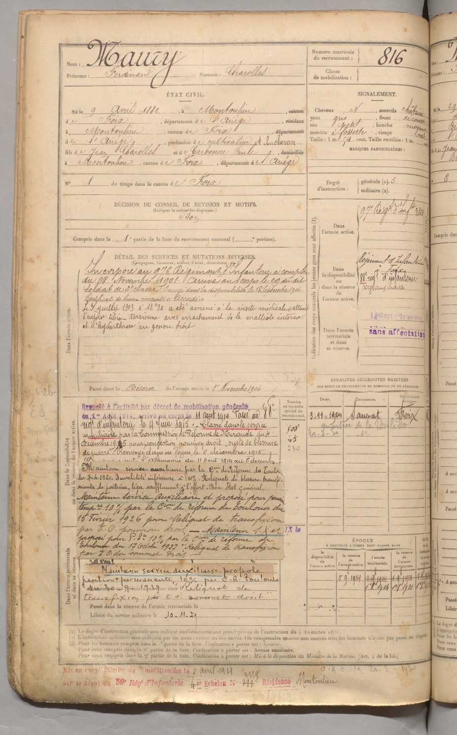 | Maury | Ferdinand dit Charolles | FOIX | 129 W 3 | 1900 | Montoulieu | Montoulieu | 816 |