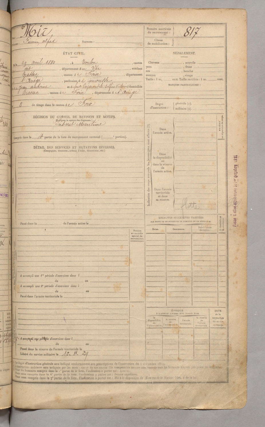 | Mir | Firmin Alfred | FOIX | 129 W 3 | 1900 | Toulon | Brassac | 817 |