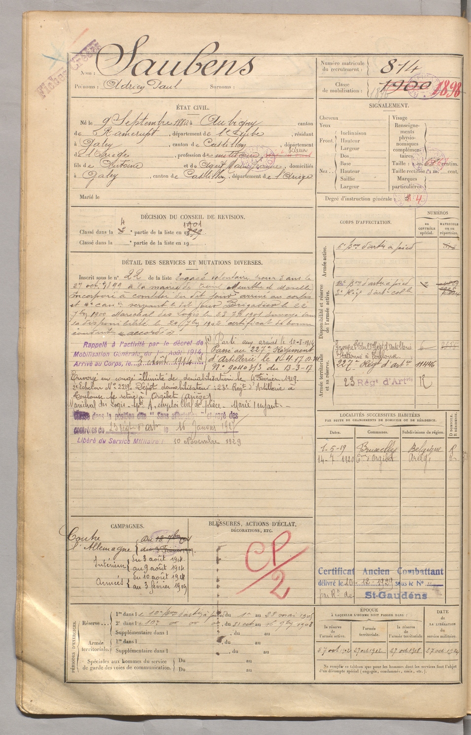 | Saubens | Adrien Paul | FOIX | 129 W 5 | 1900 | Aubigny | Galey | 814 |