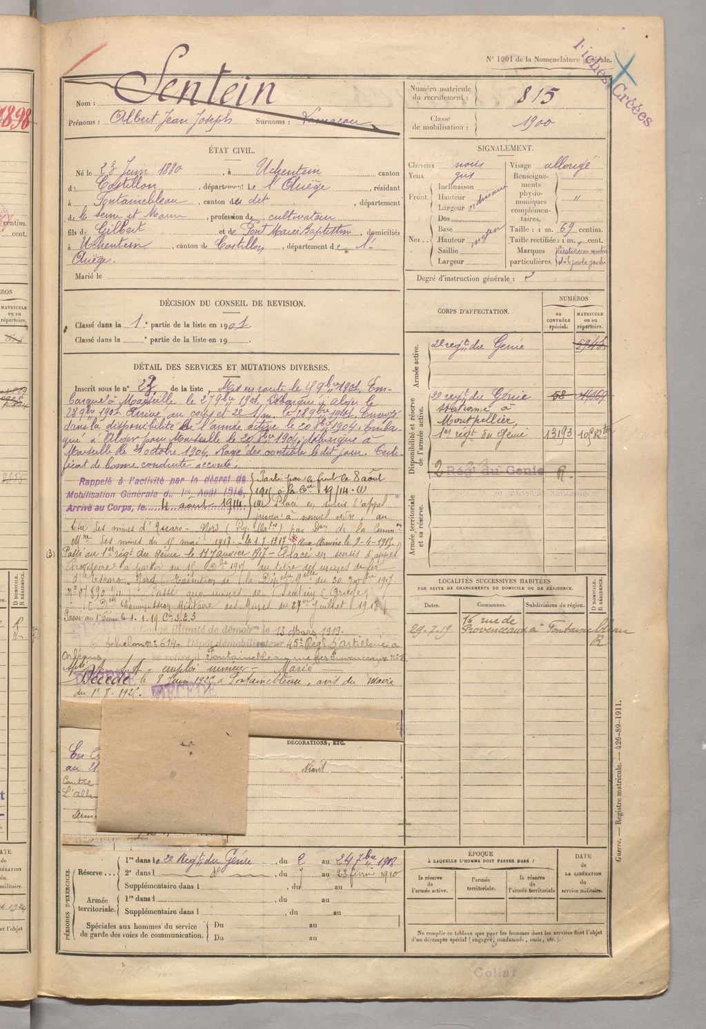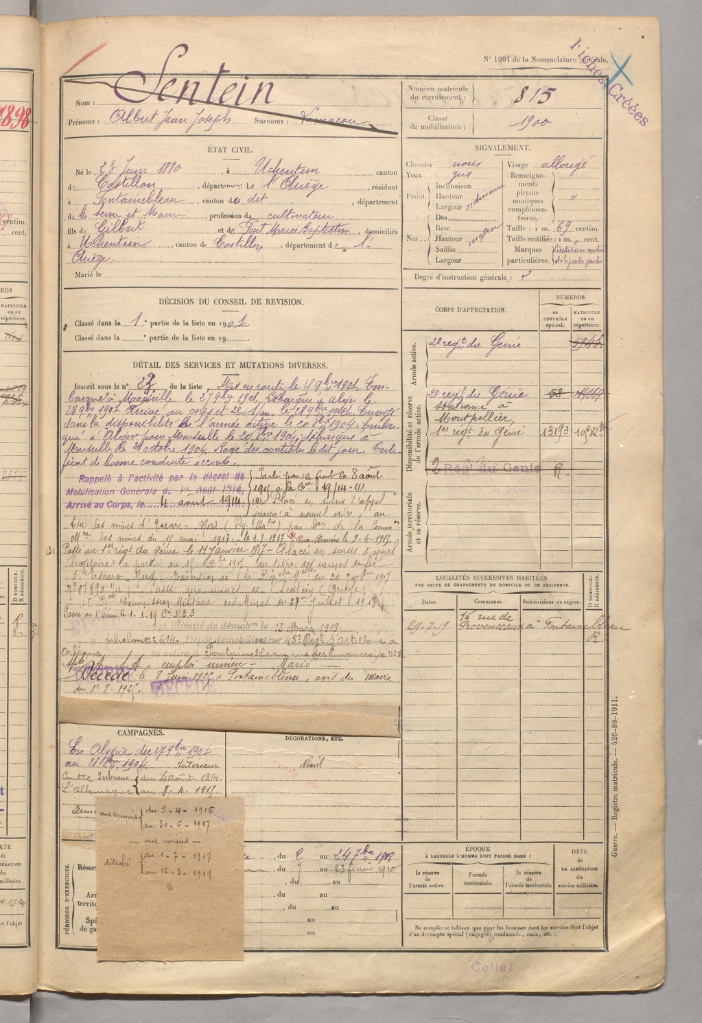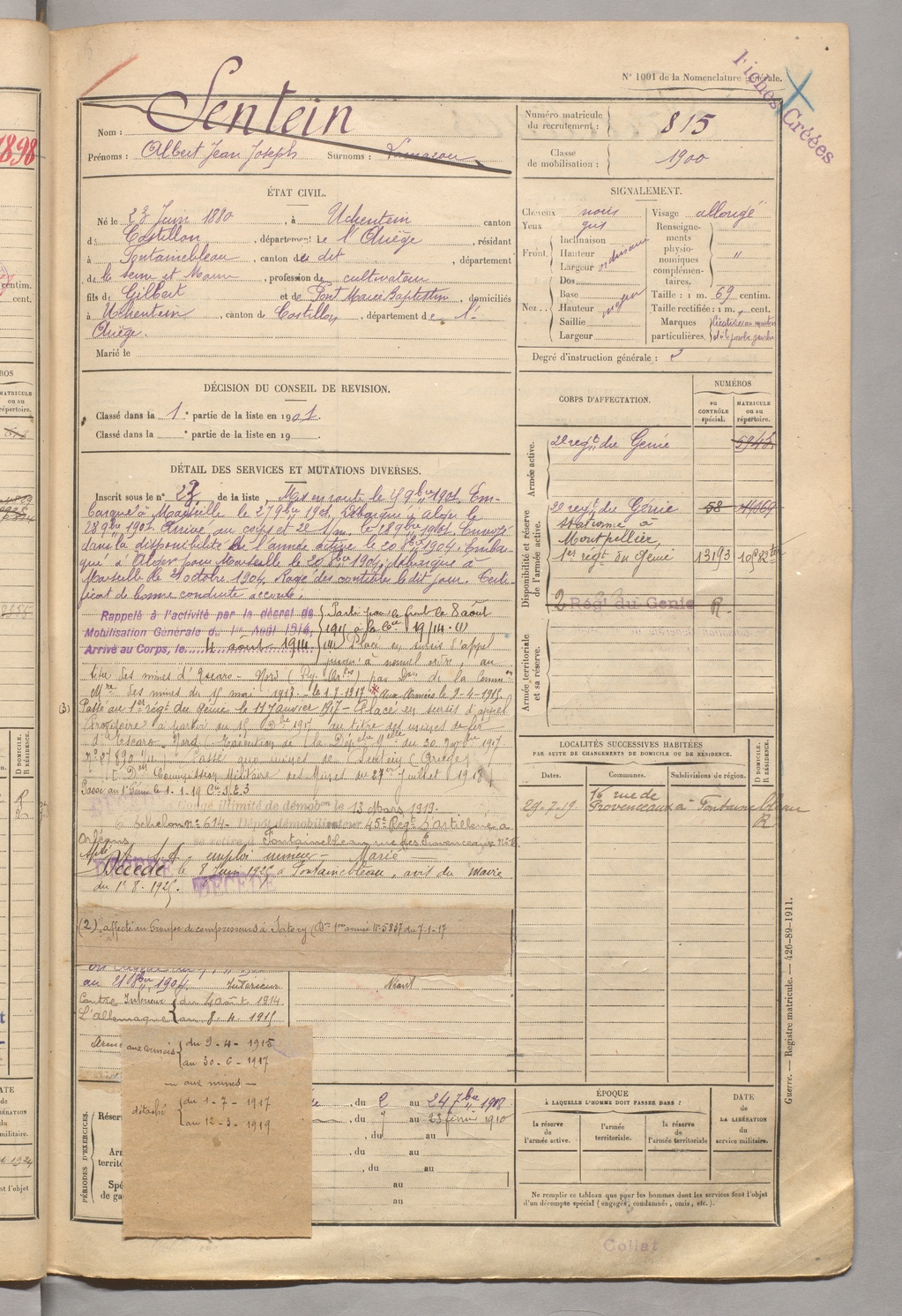 | Sentein | Albert Jean Joseph dit Lamazou | FOIX | 129 W 5 | 1900 | Uchentein | Fontainebleau | 815 |