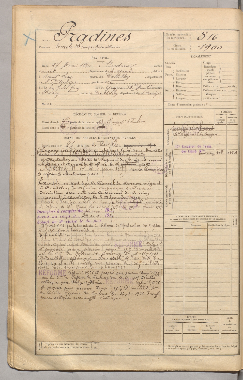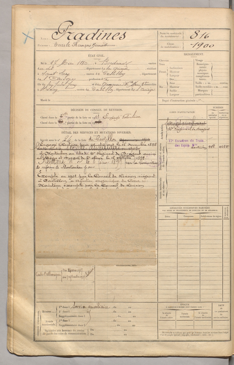| Pradines | Emile François Bernard | FOIX | 129 W 5 | 1900 | Bordeaux | Saint-Lary | 816 |