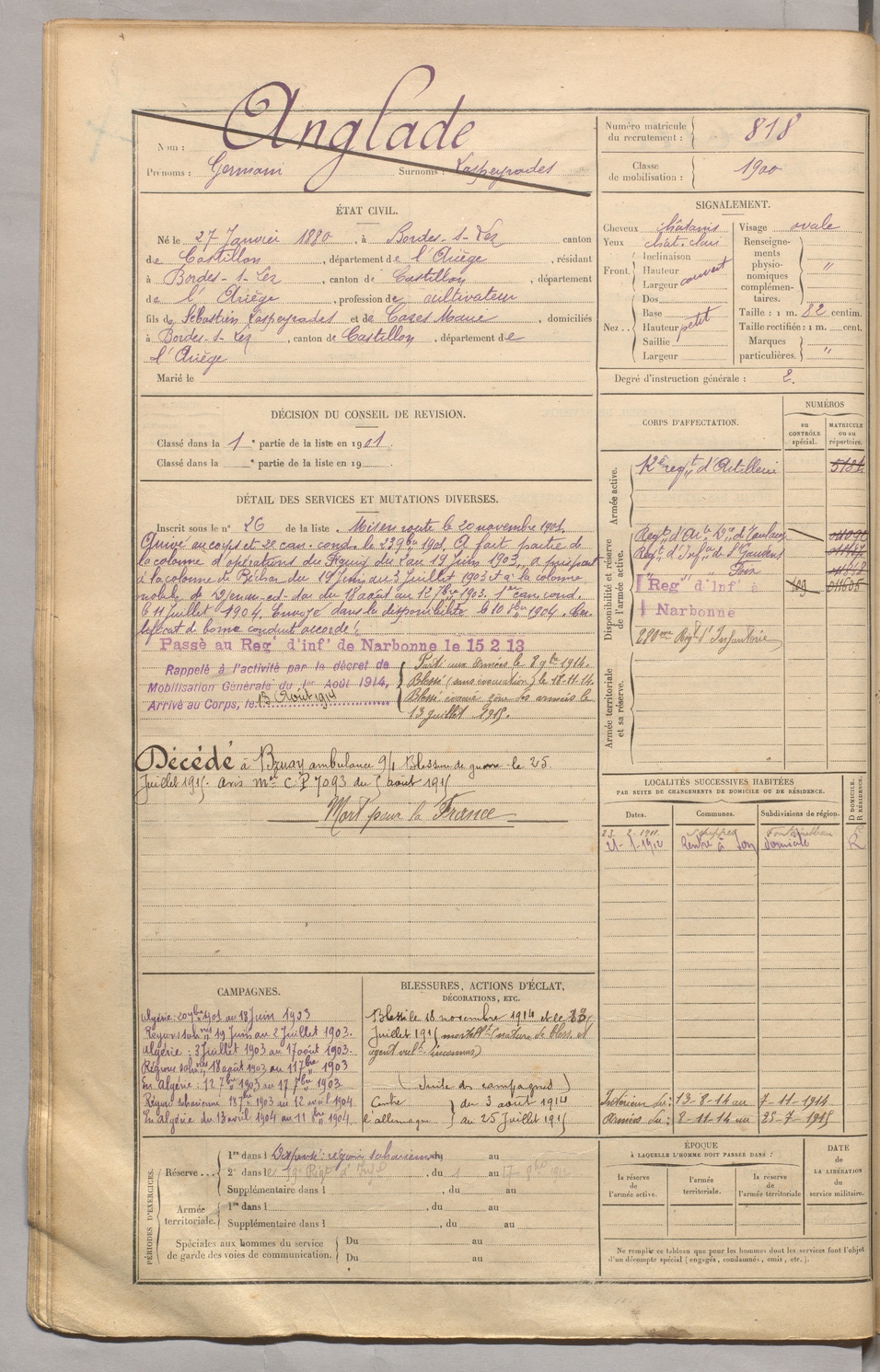 | Anglade | Germain dit Laspeyrades | FOIX | 129 W 5 | 1900 | Bordes-sur-Lez | Bordes-sur-Lez | 818 |