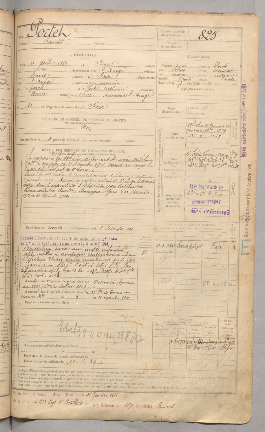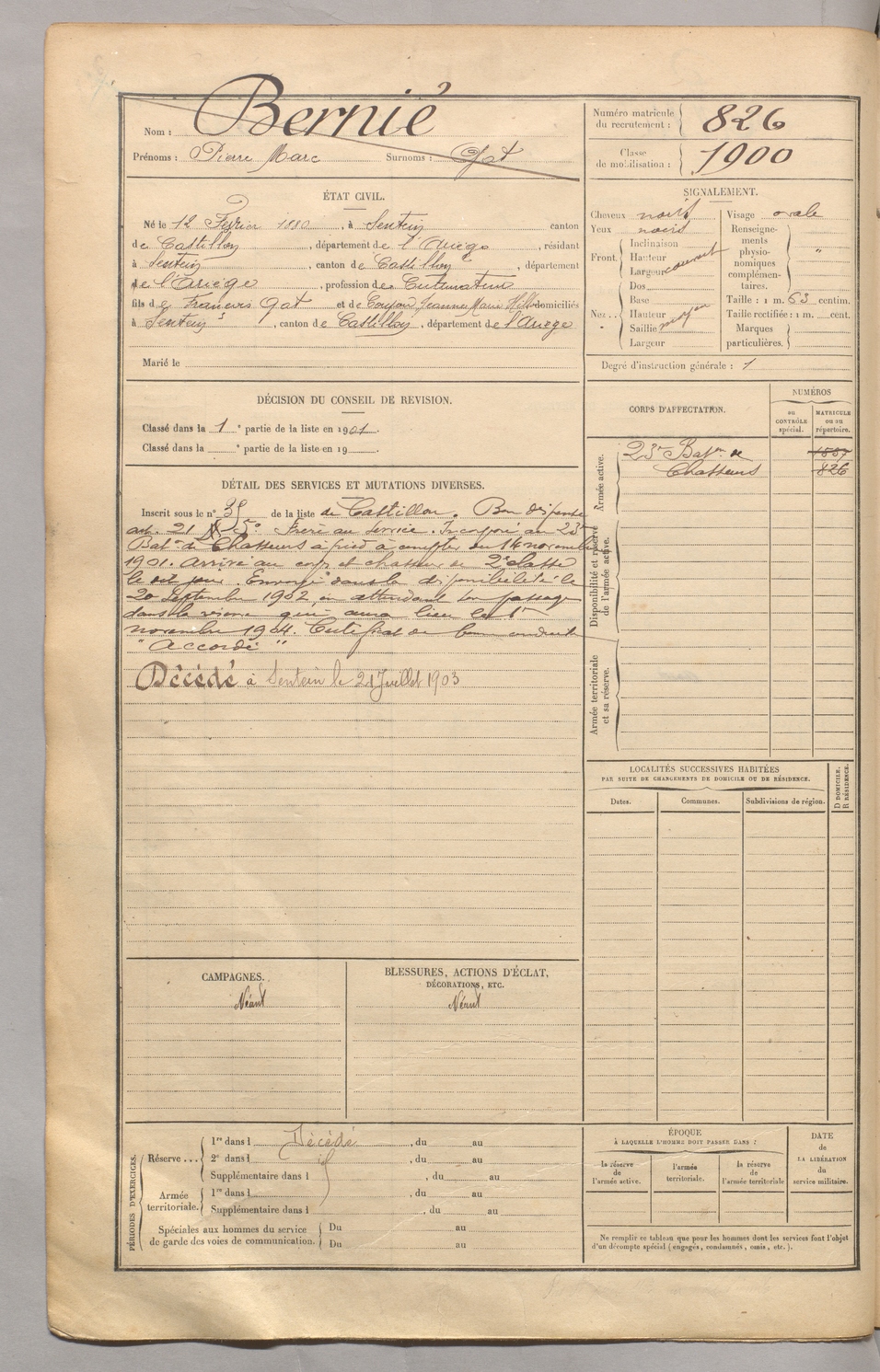 | Bernié | Pierre Marc dit Gat | FOIX | 129 W 5 | 1900 | Sentein | Sentein | 826 |