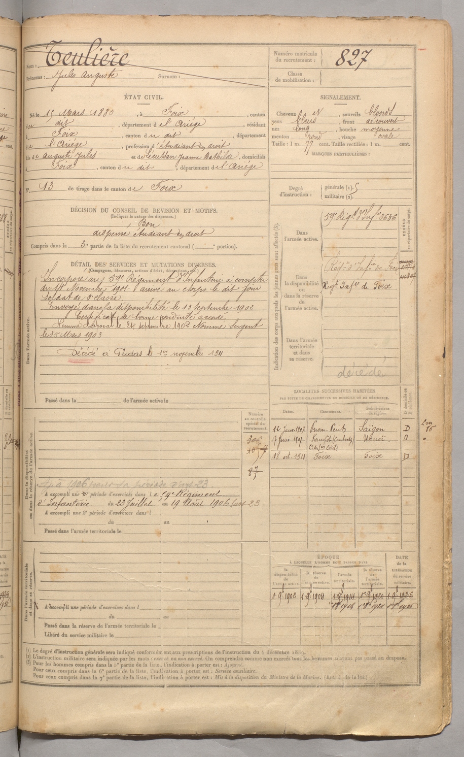 | Teulière | Jules Auguste | FOIX | 129 W 3 | 1900 | Foix | Foix | 827 |