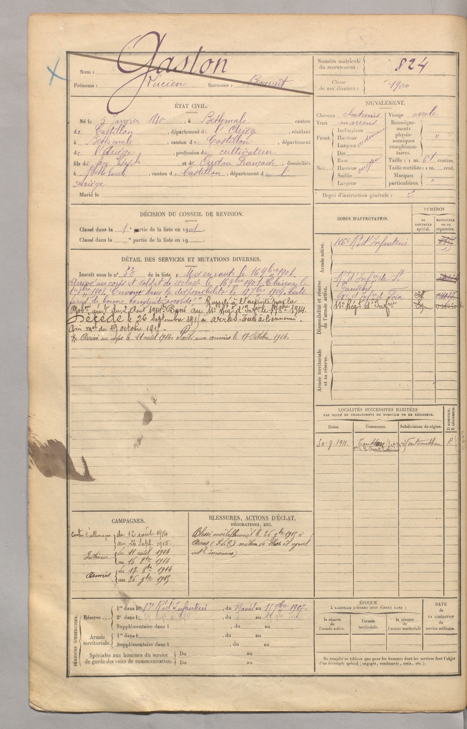 | Gaston | Lucien dit Bourrut | FOIX | 129 W 5 | 1900 | Bethmale | Bethmale | 824 |