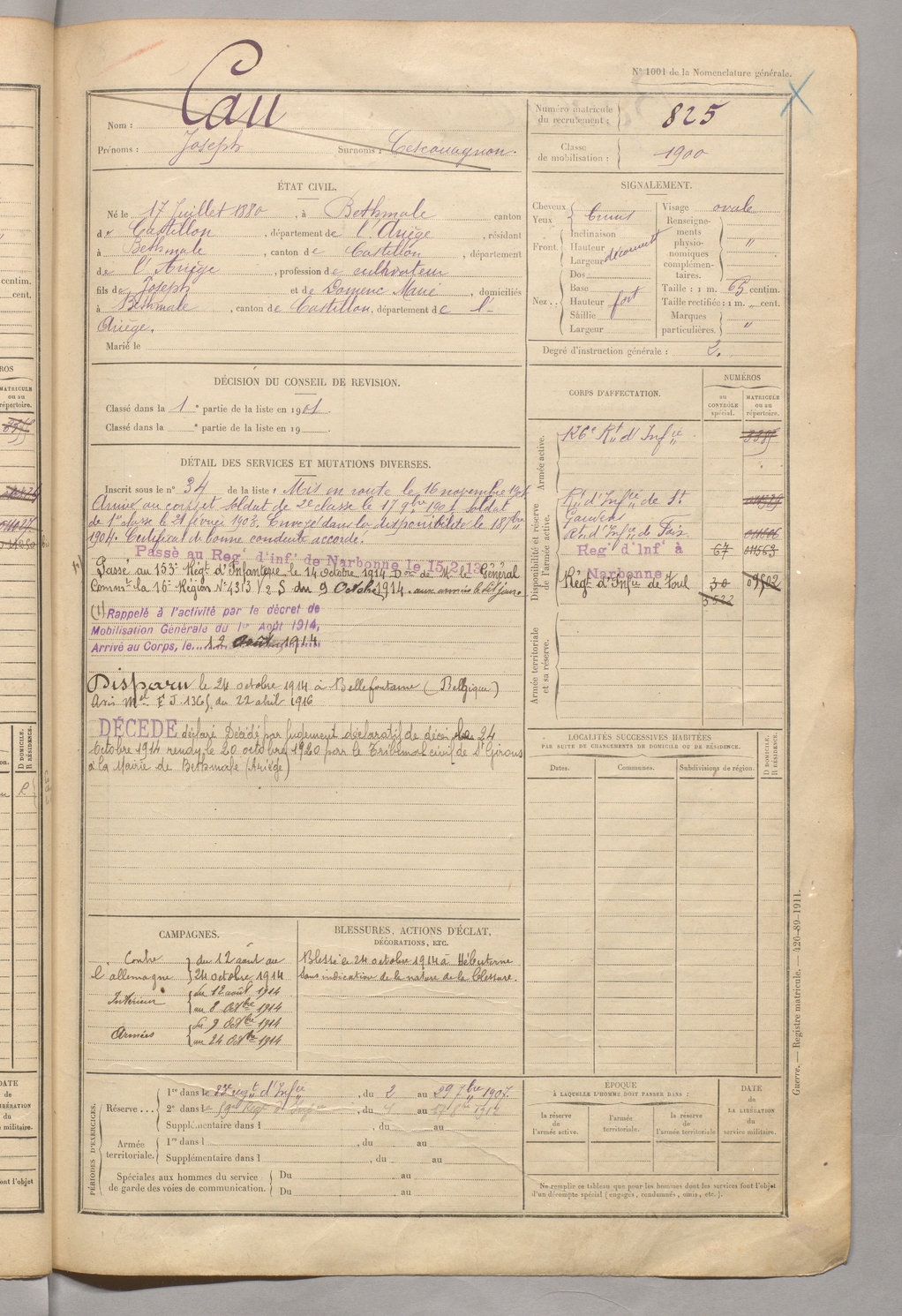 | Cau | Joseph dit Cescouagnon | FOIX | 129 W 5 | 1900 | Bethmale | Bethmale | 825 |