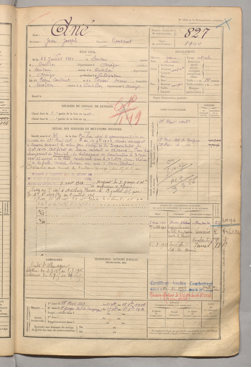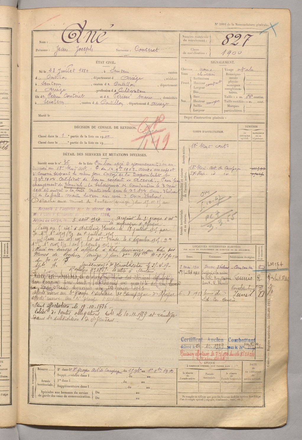 | Ané | Jean Joseph dit Couteret | FOIX | 129 W 5 | 1900 | Sentein | Sentein | 827 |