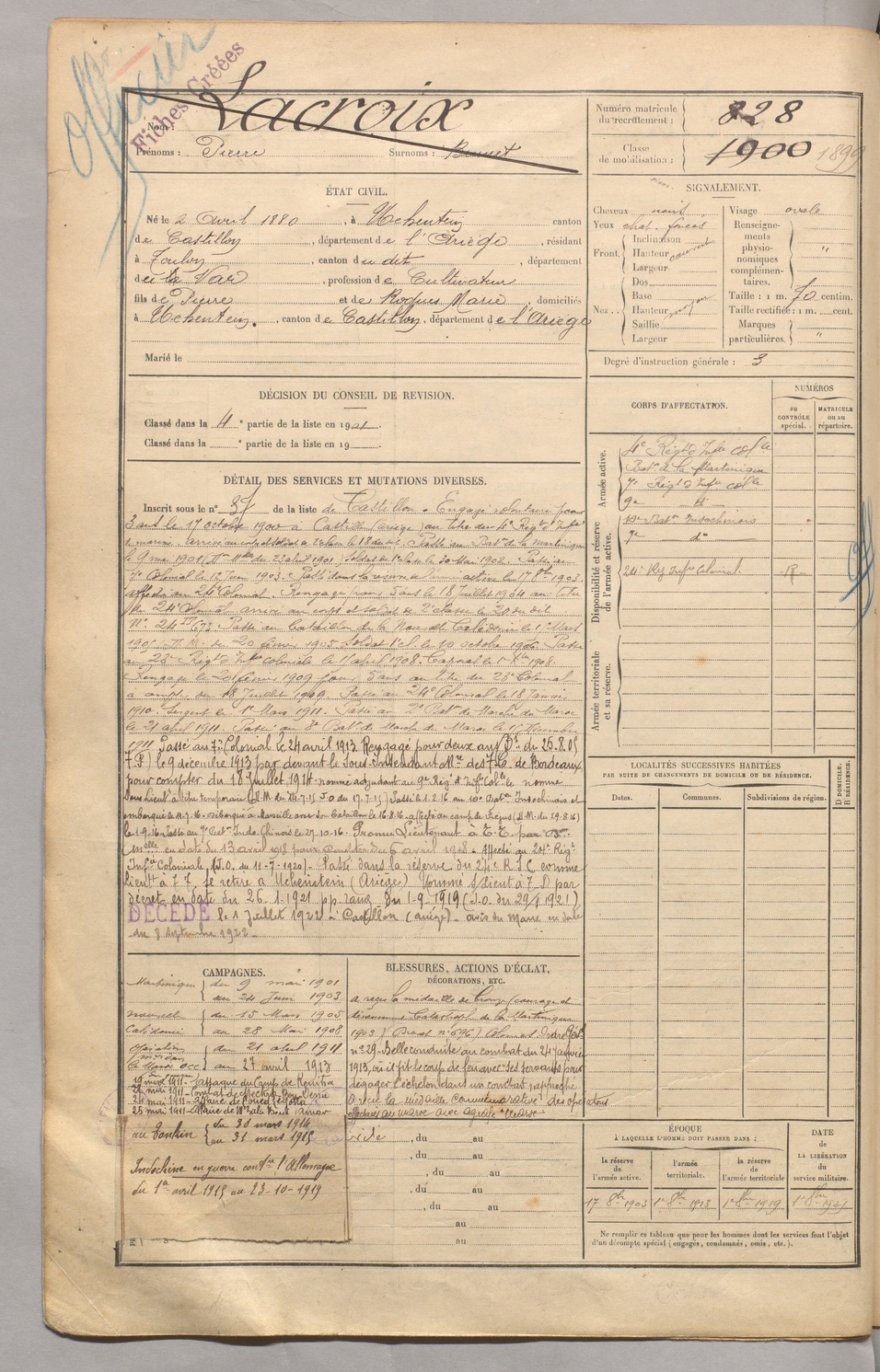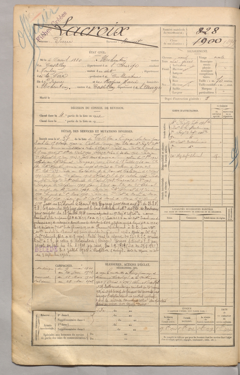 | Lacroix | Pierre dit Bonnet | FOIX | 129 W 5 | 1900 | Uchentein | Toulon | 828 |