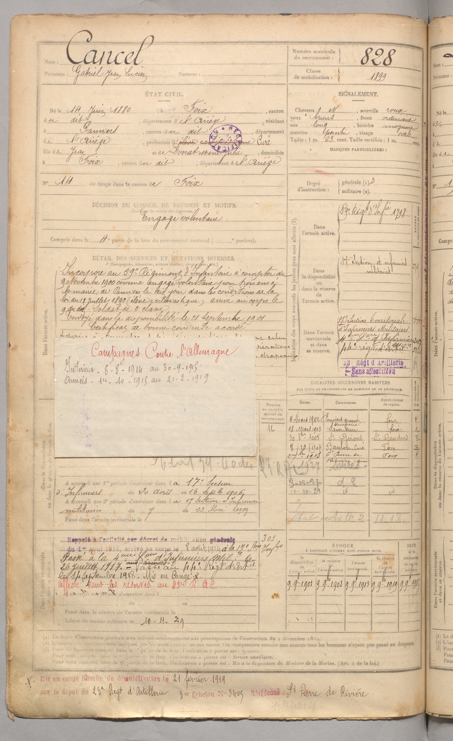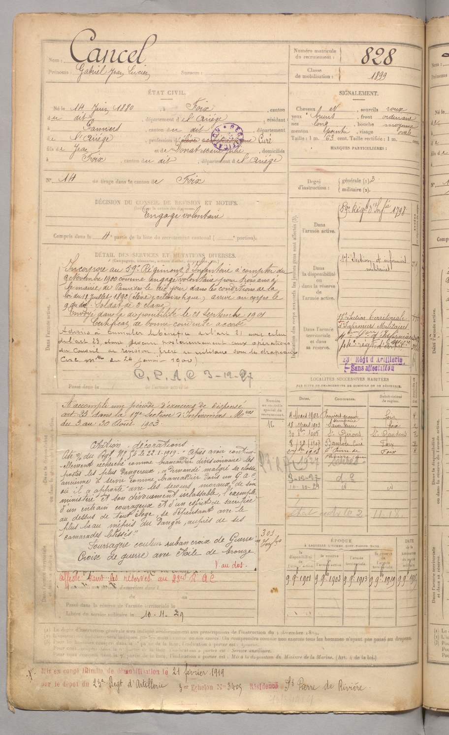 | Cancel | Gabriel Jean Lucien | FOIX | 129 W 3 | 1900 | Foix | Pamiers | 828 |