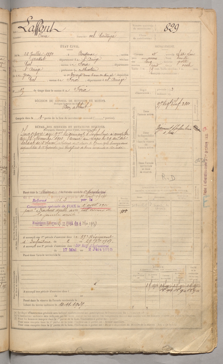 | Laffont | Pierre dit Del Cardayré | FOIX | 129 W 3 | 1900 | Boussenac | Cos | 829 |