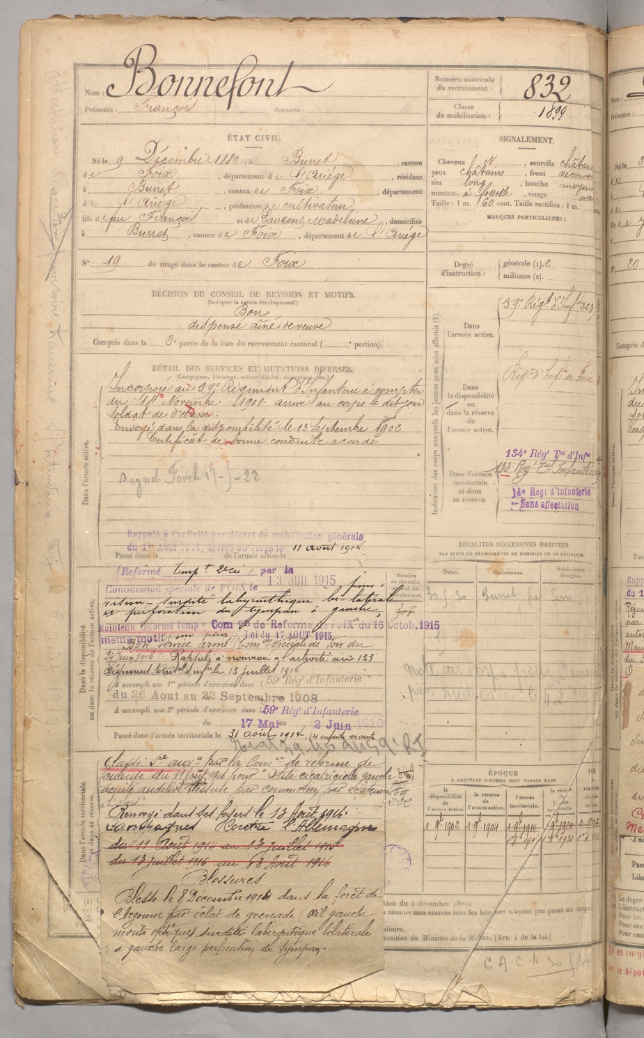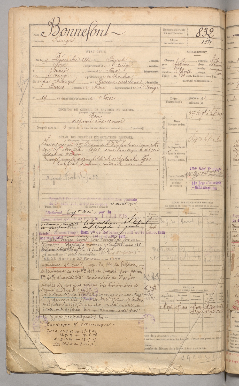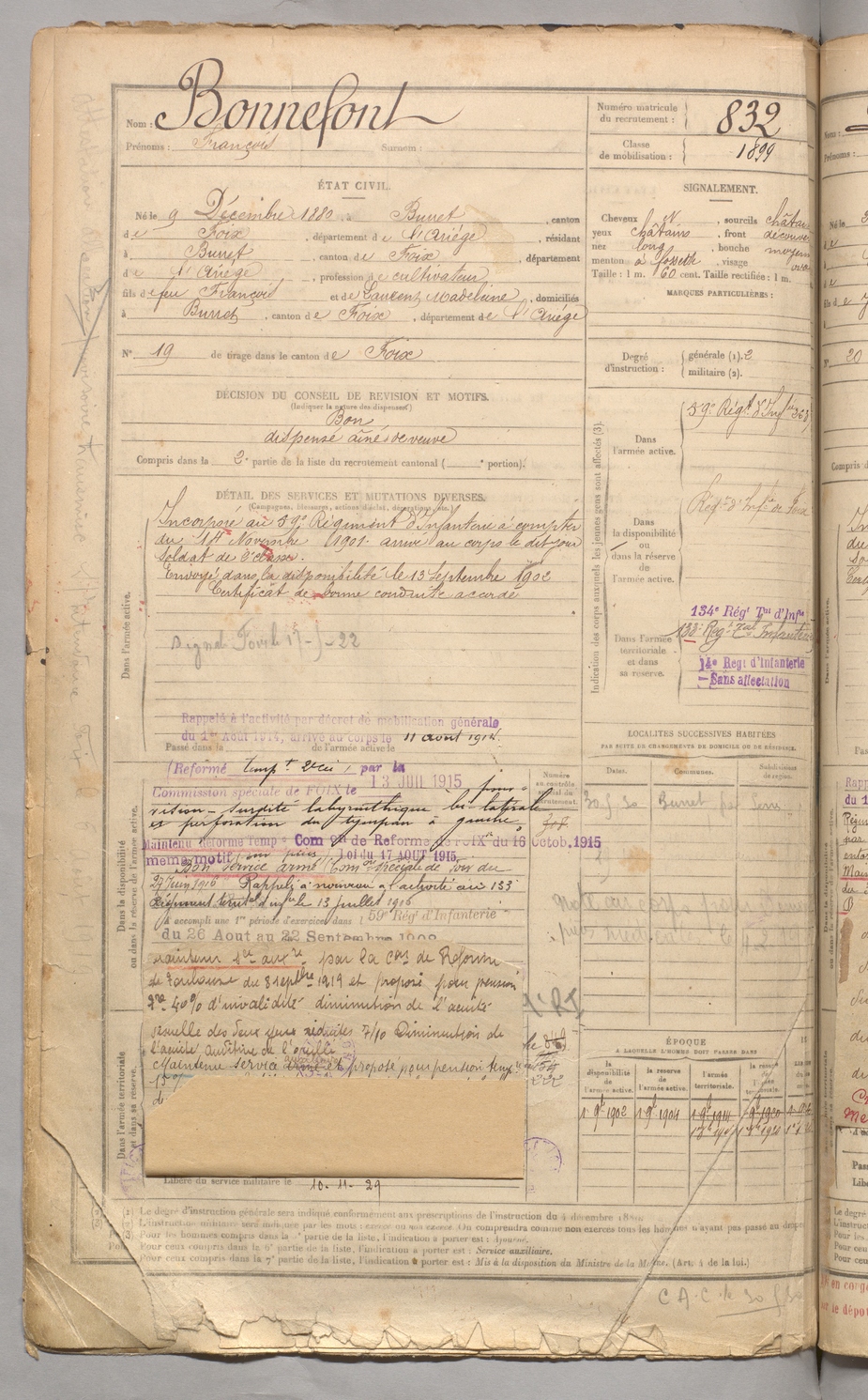 | Bonnefont | François | FOIX | 129 W 3 | 1900 | Burret | Burret | 832 |