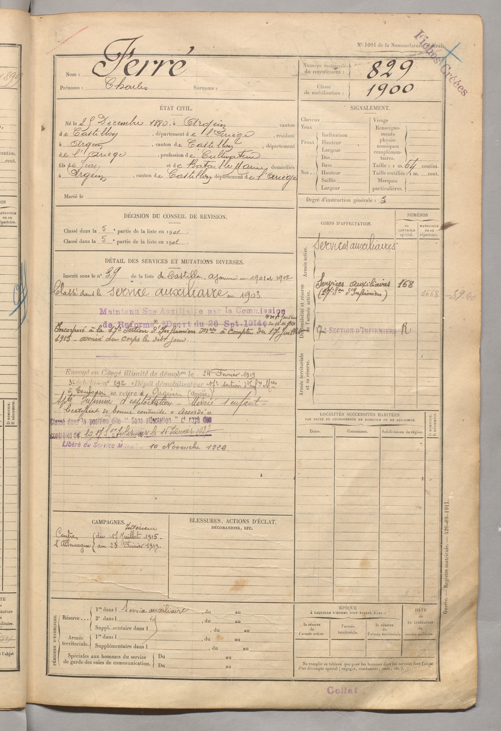 | Ferré | Charles | FOIX | 129 W 5 | 1900 | Argein | Argein | 829 |