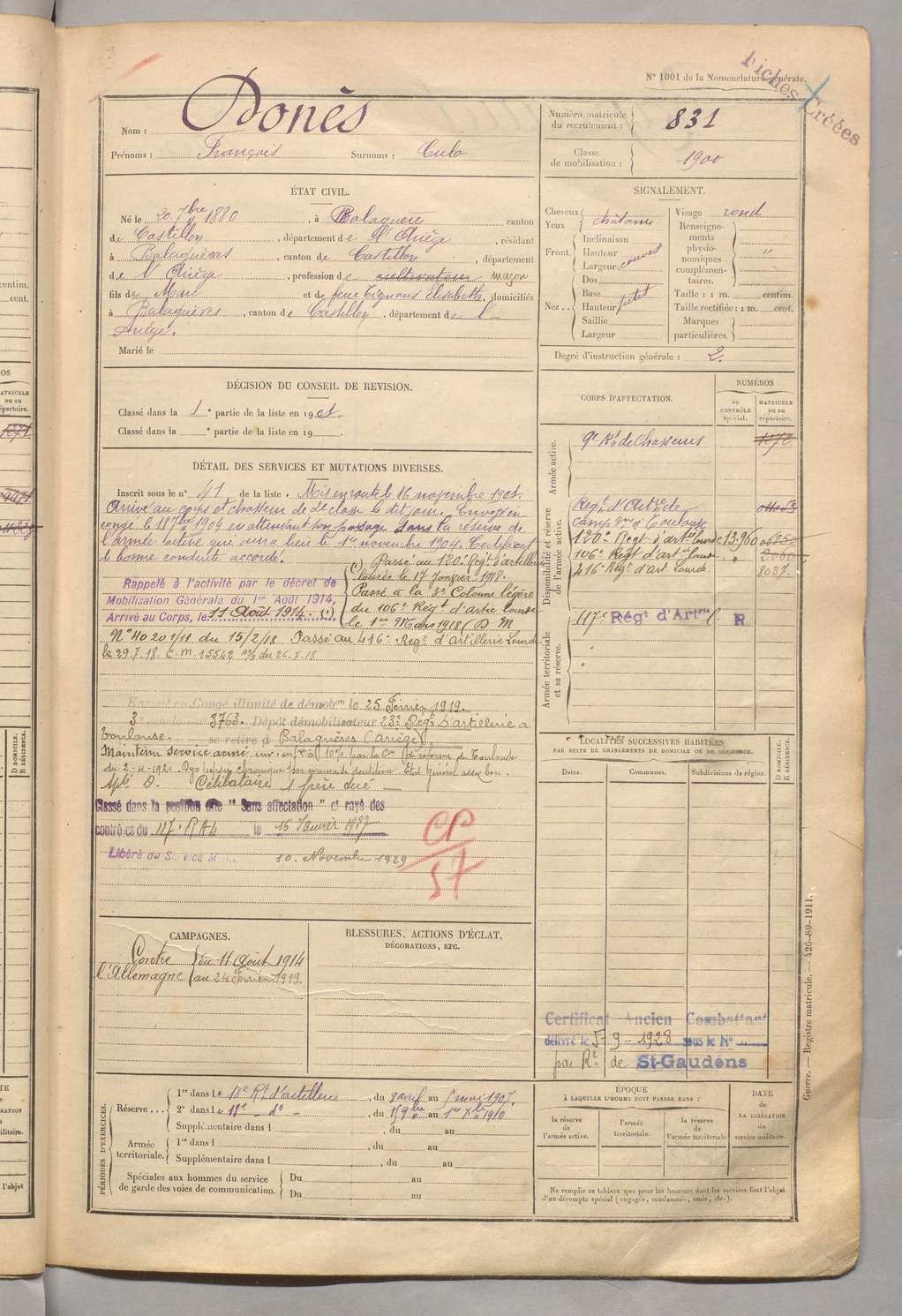 | Donès | François dit Culo | FOIX | 129 W 5 | 1900 | Balaguères | Balaguères | 831 |