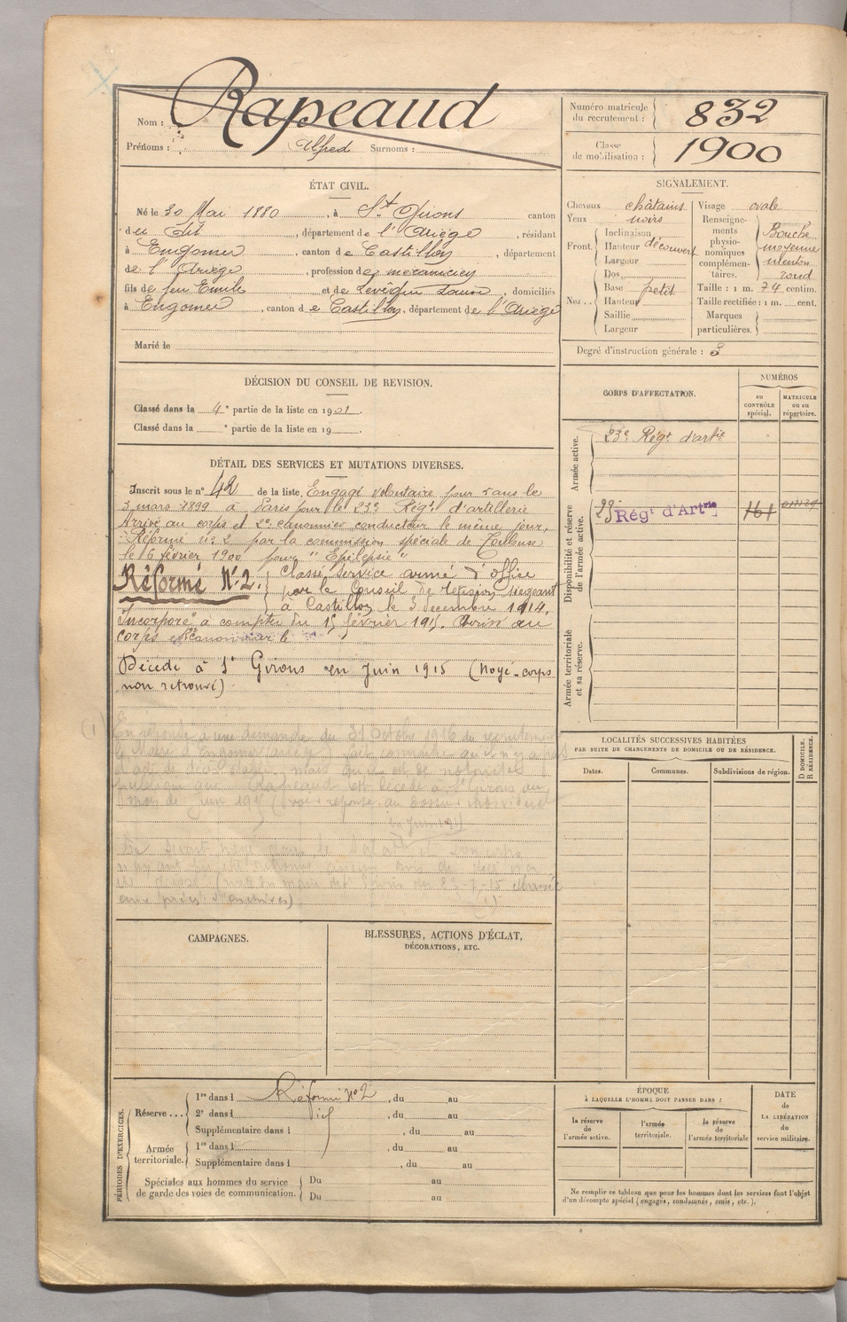 | Rapeaud | Alfred | FOIX | 129 W 5 | 1900 | Saint-Girons | Engomer | 832 |