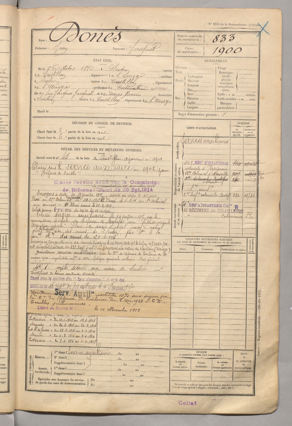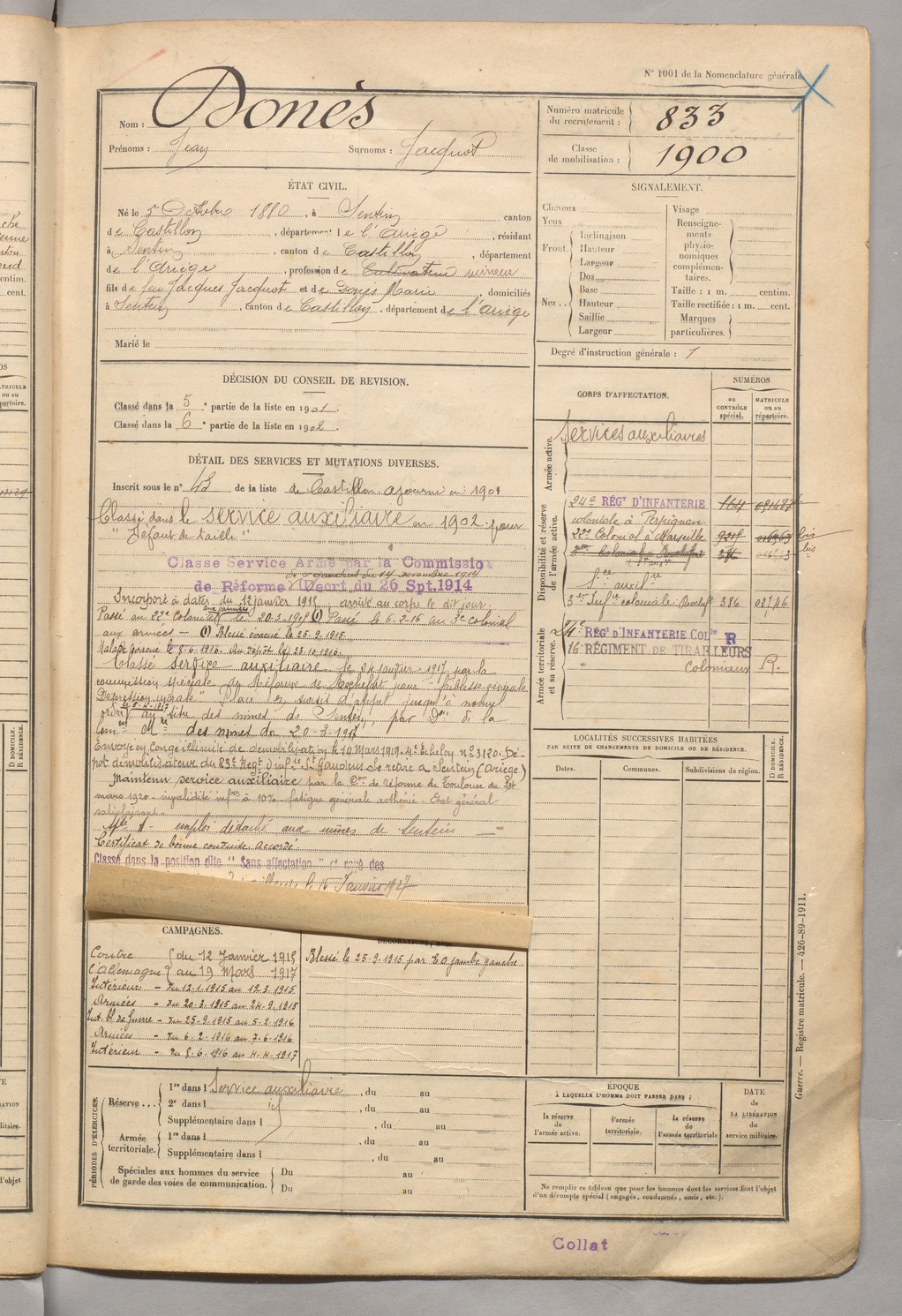 | Donès | Jean dit Jacquot | FOIX | 129 W 5 | 1900 | Sentein | Sentein | 833 |
