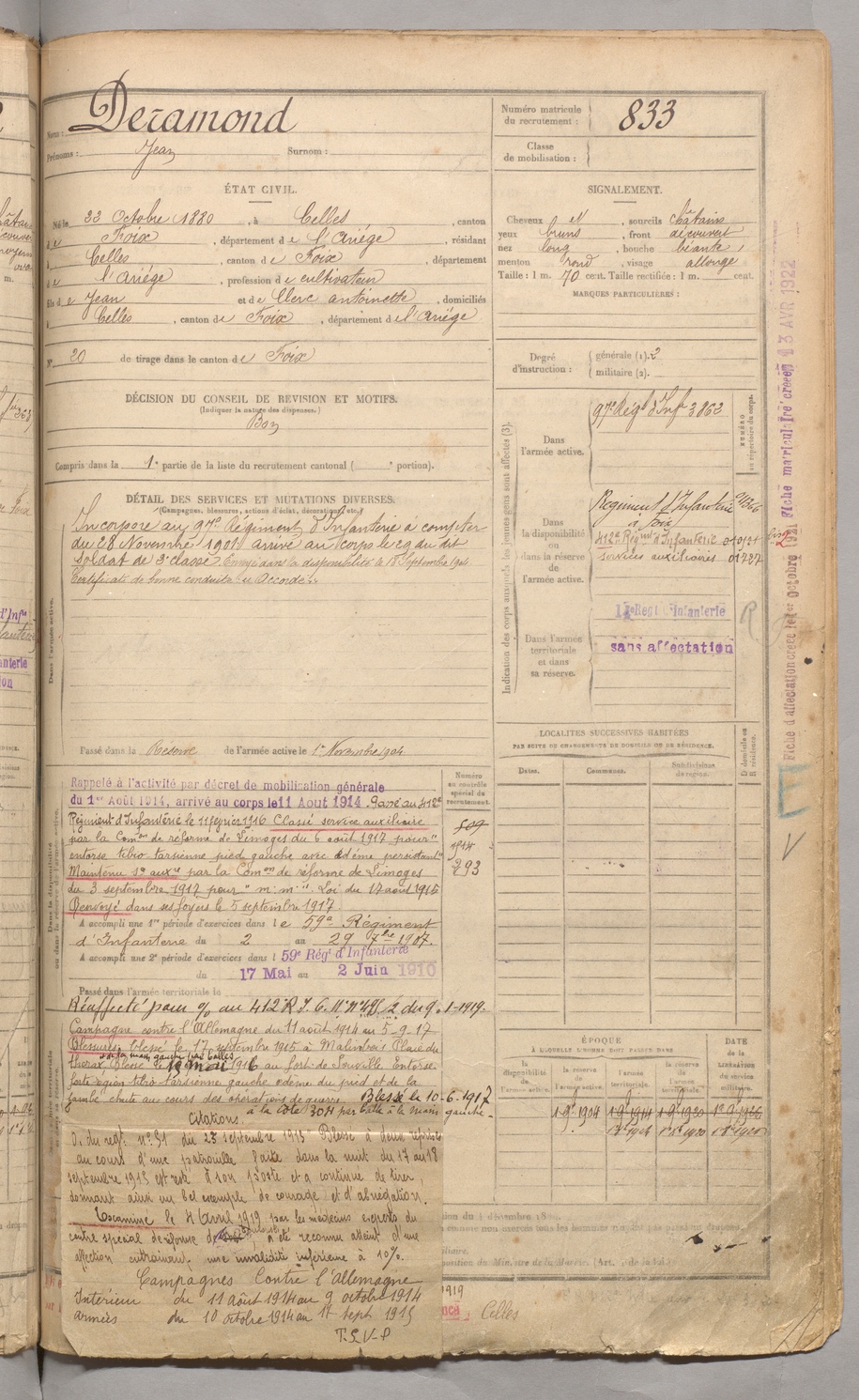 | Deramond | Jean | FOIX | 129 W 3 | 1900 | Celles | Celles | 833 |