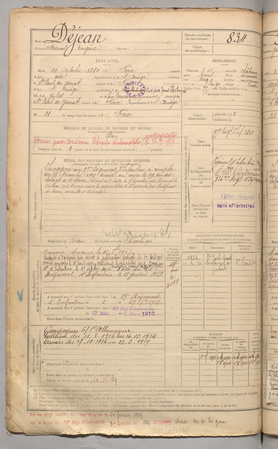 | Déjean | Marius Eugène | FOIX | 129 W 3 | 1900 | Foix | Saint-Paul-de-Jarrat | 834 |