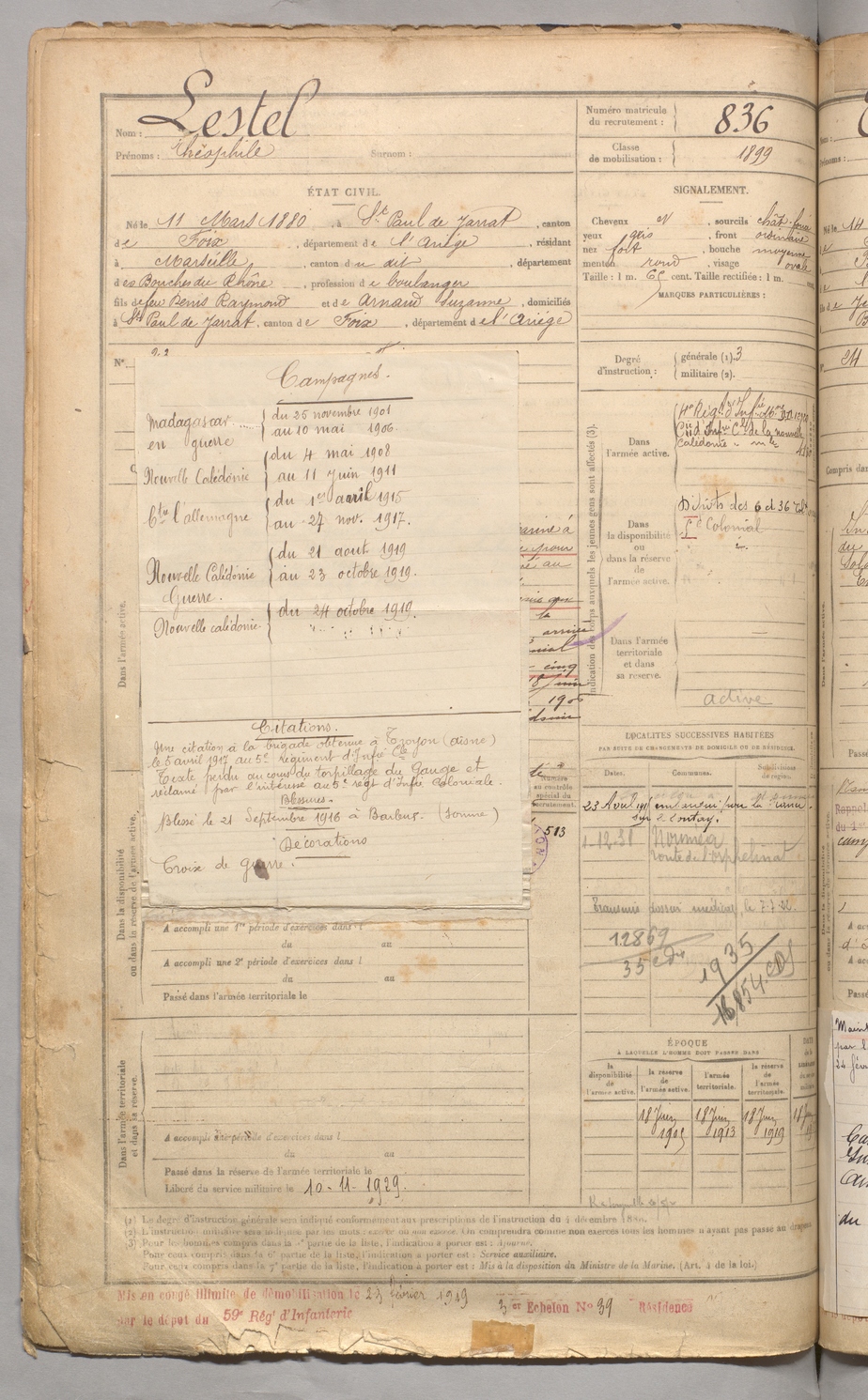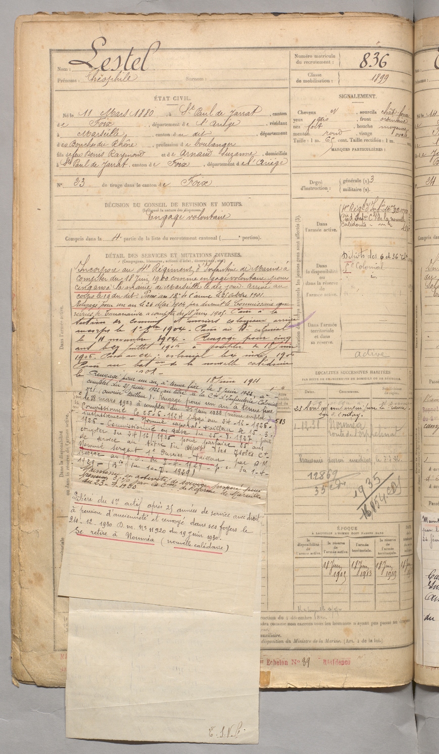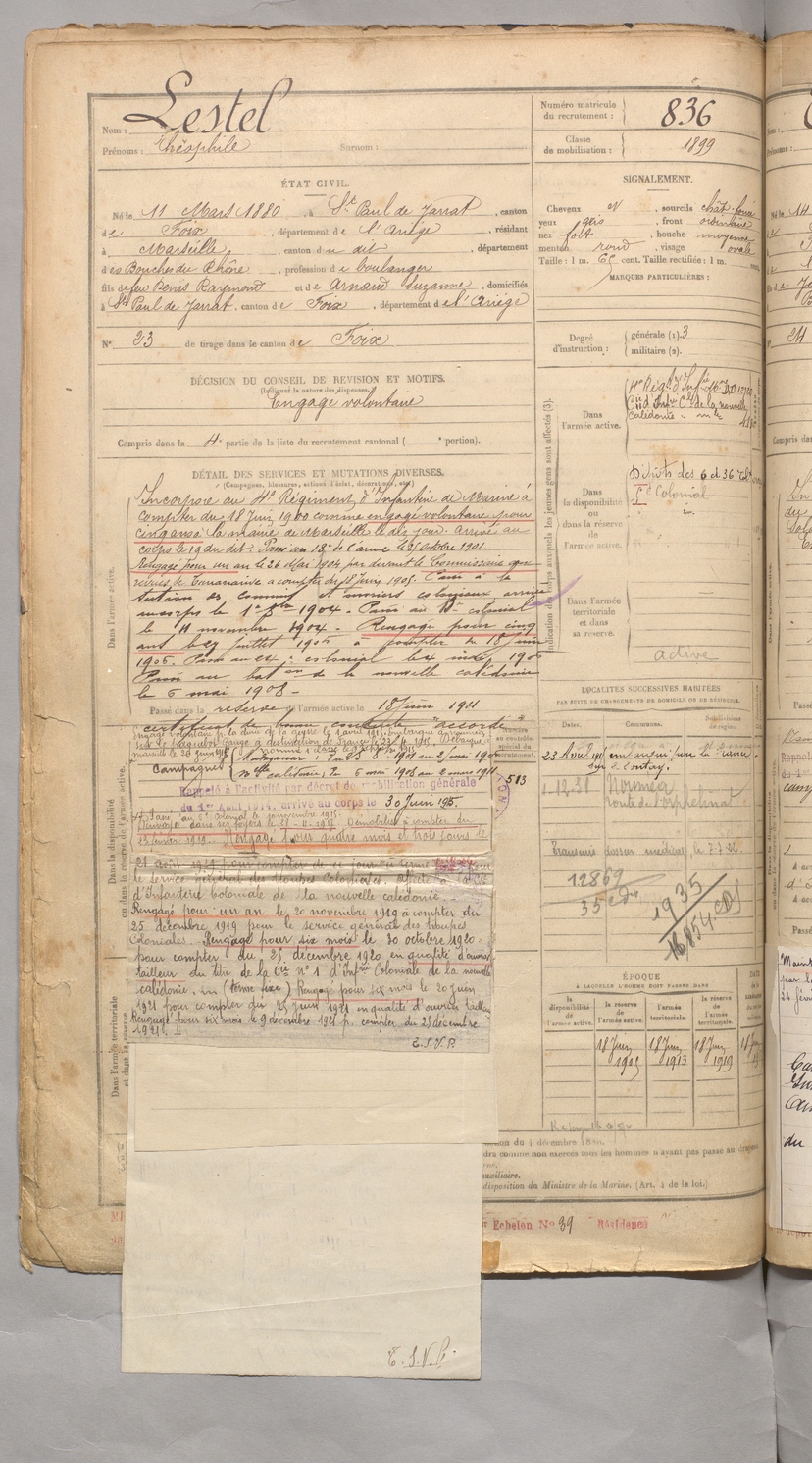 | Lestel | Théophile | FOIX | 129 W 3 | 1900 | Saint-Paul-de-Jarrat | Marseille | 836 |