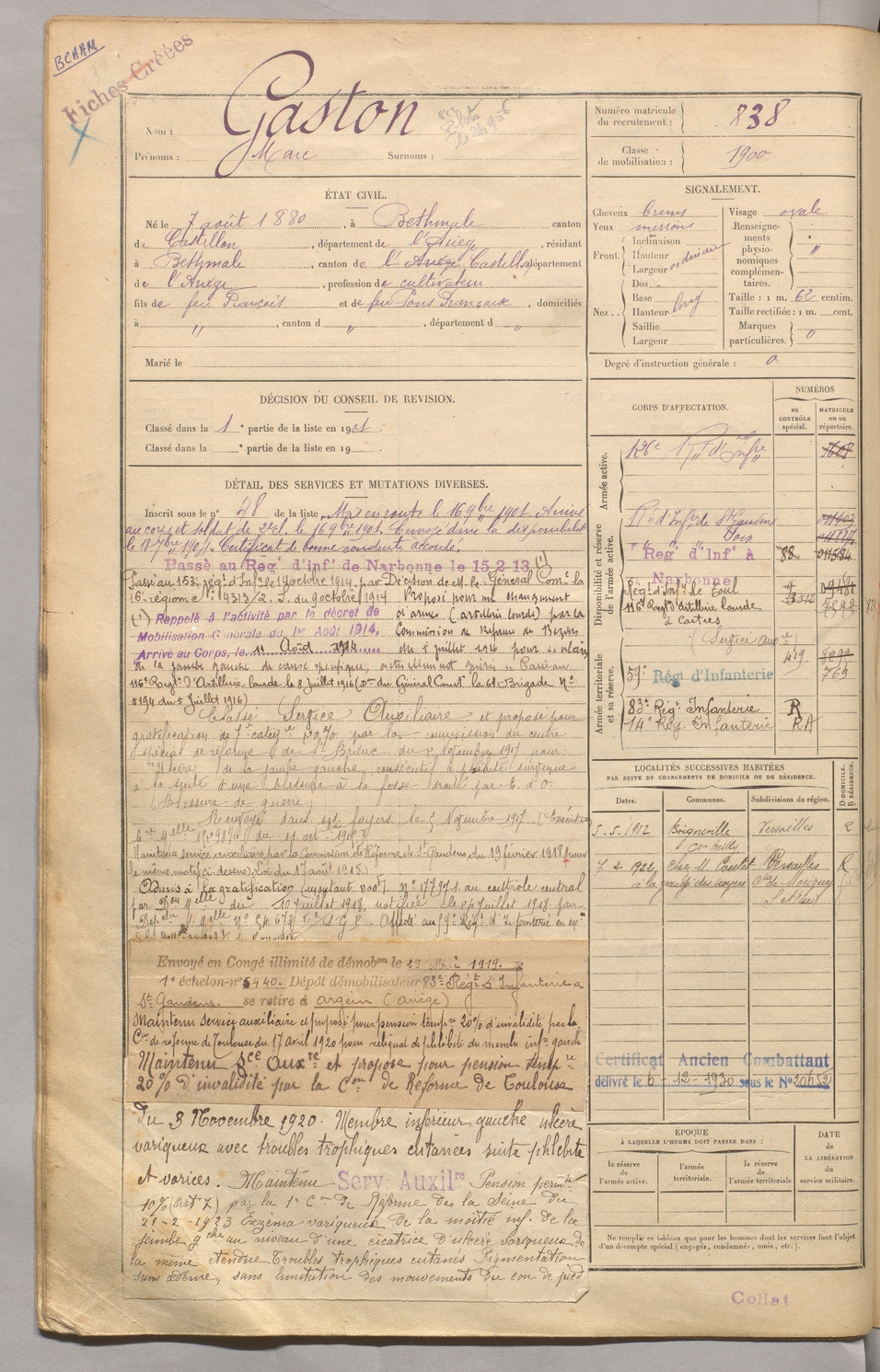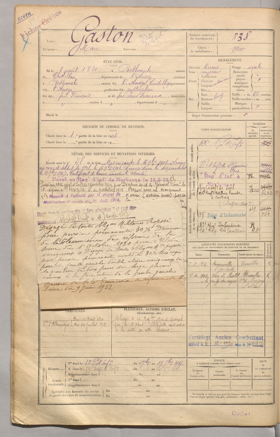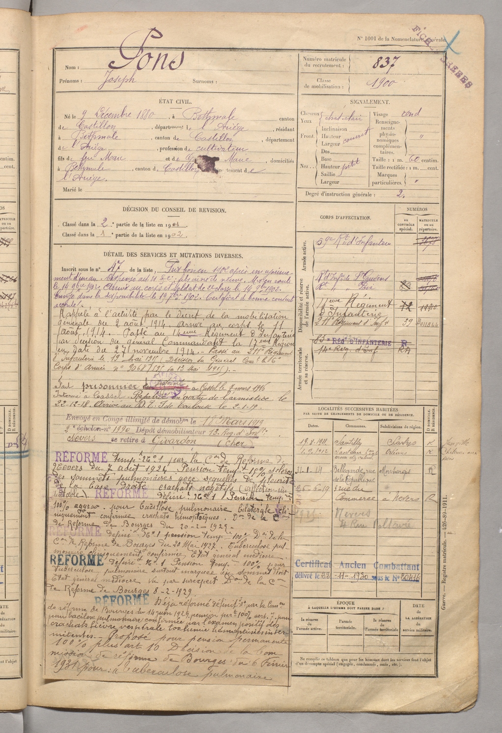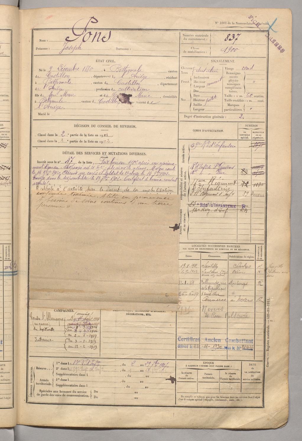 | Lestel | Théophile | FOIX | 129 W 3 | 1900 | Saint-Paul-de-Jarrat | Marseille | 836 |
