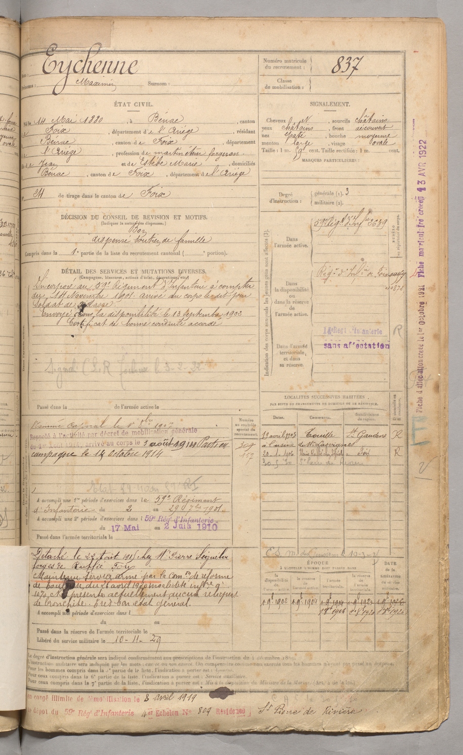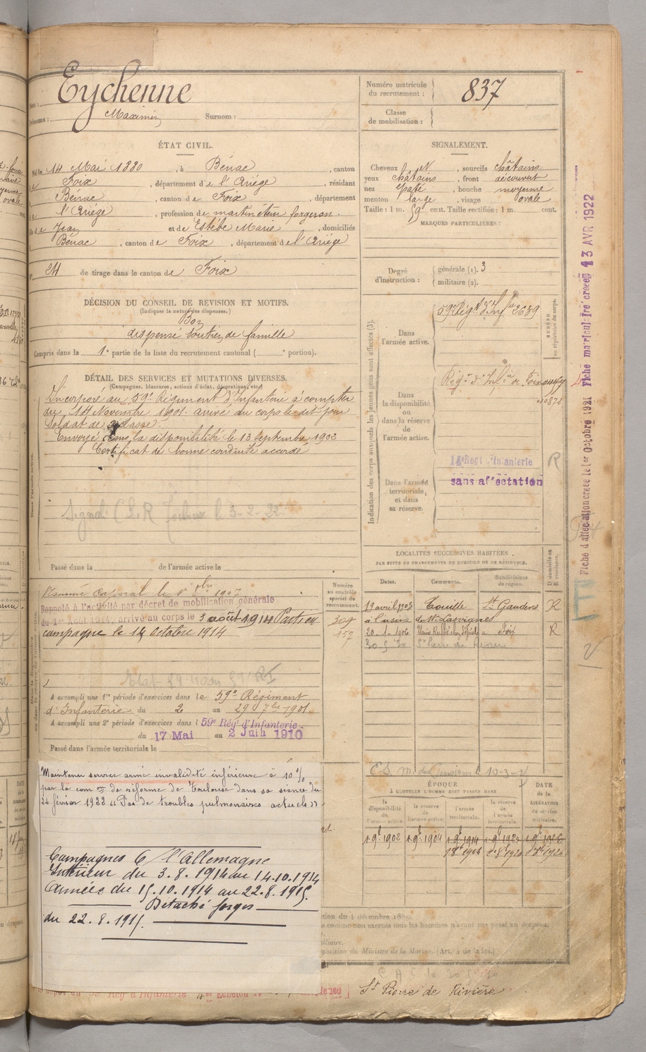 | Eychenne | Maximin | FOIX | 129 W 3 | 1900 | Bénac | Bénac | 837 |