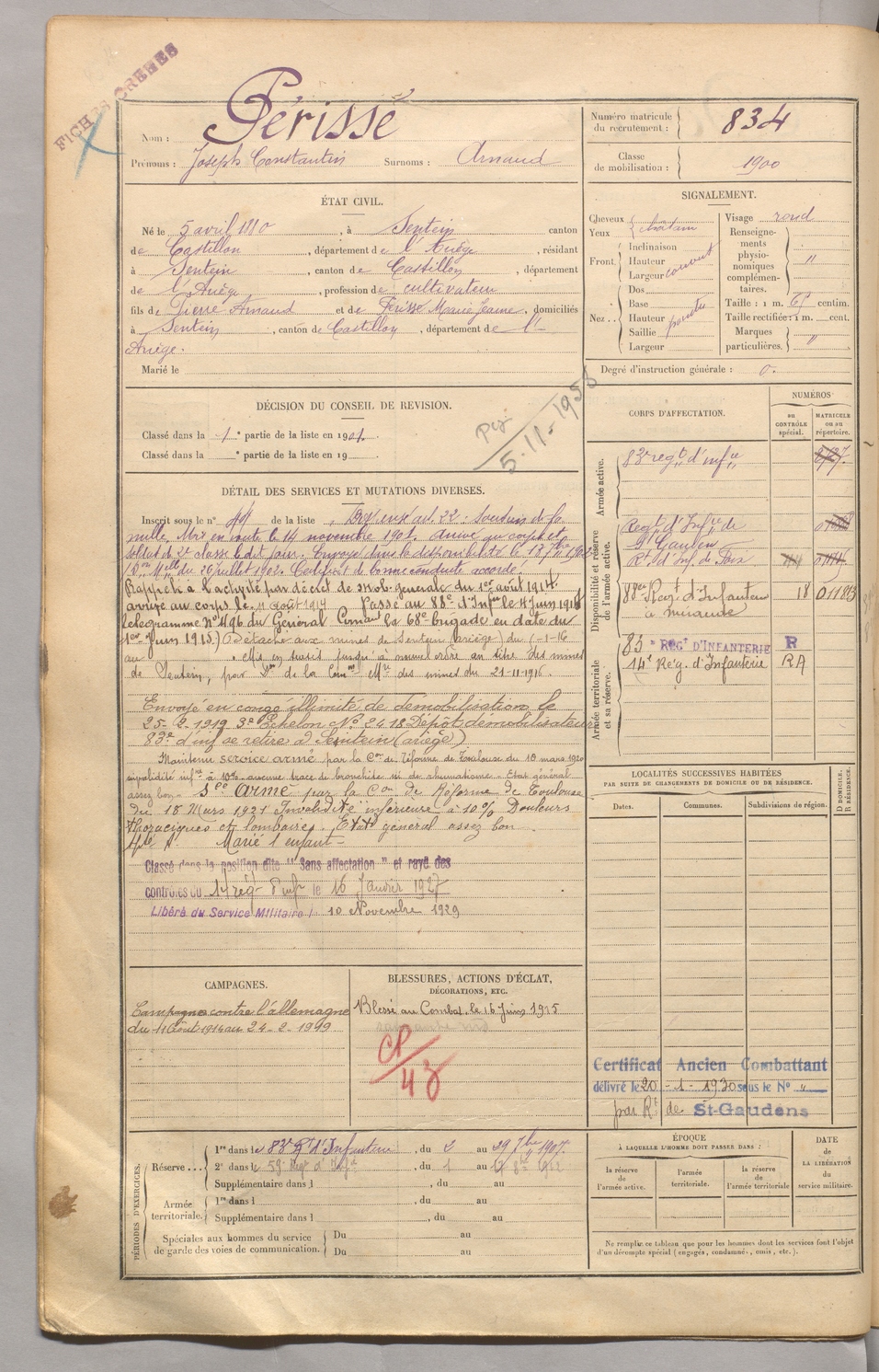 | Périssé | Joseph Constantin dit Arnaud | FOIX | 129 W 5 | 1900 | Sentein | Sentein | 834 |