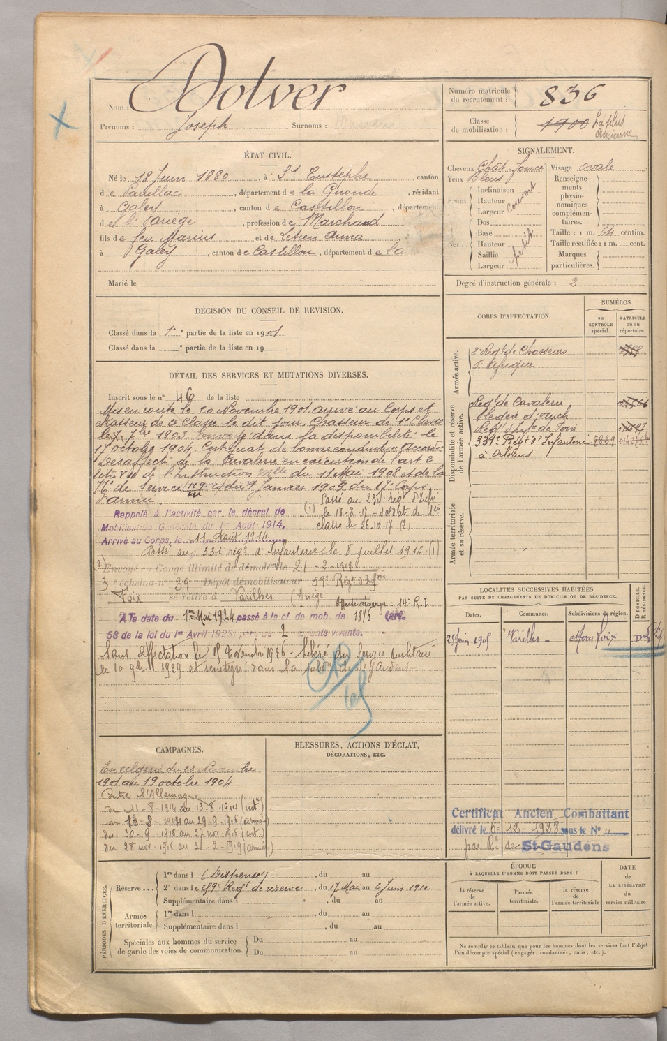 | Dolver | Joseph | FOIX | 129 W 5 | 1900 | Saint-Eustèphe | Galey | 836 |