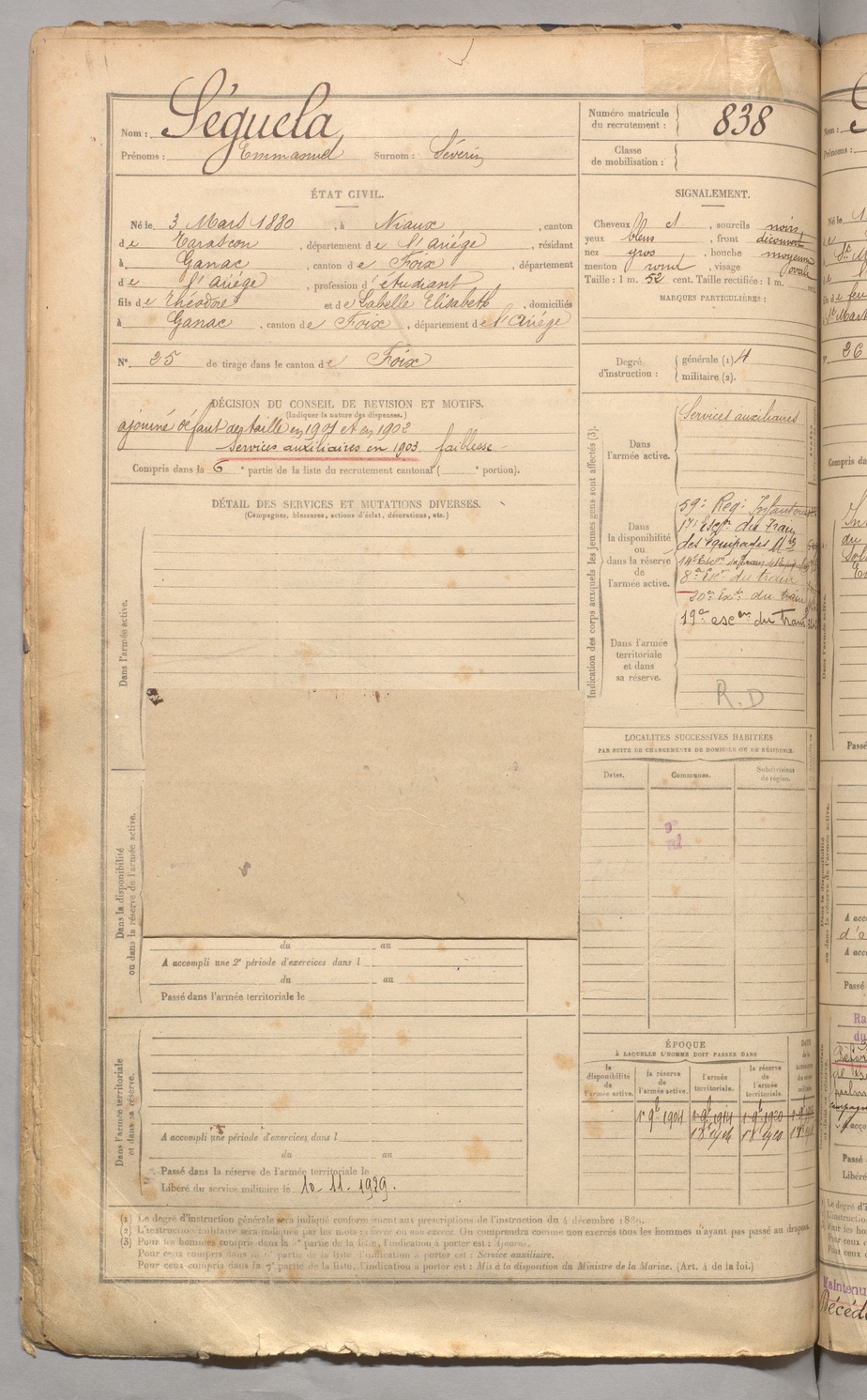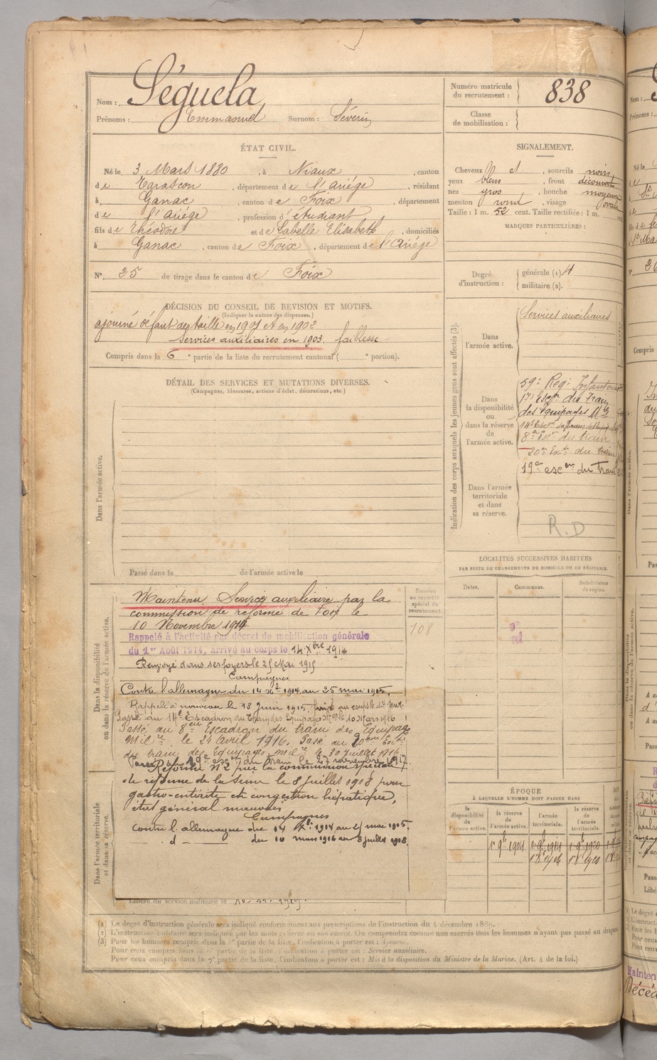 | Séguela | Emmanuel dit Séverin | FOIX | 129 W 3 | 1900 | Niaux | Ganac | 838 |