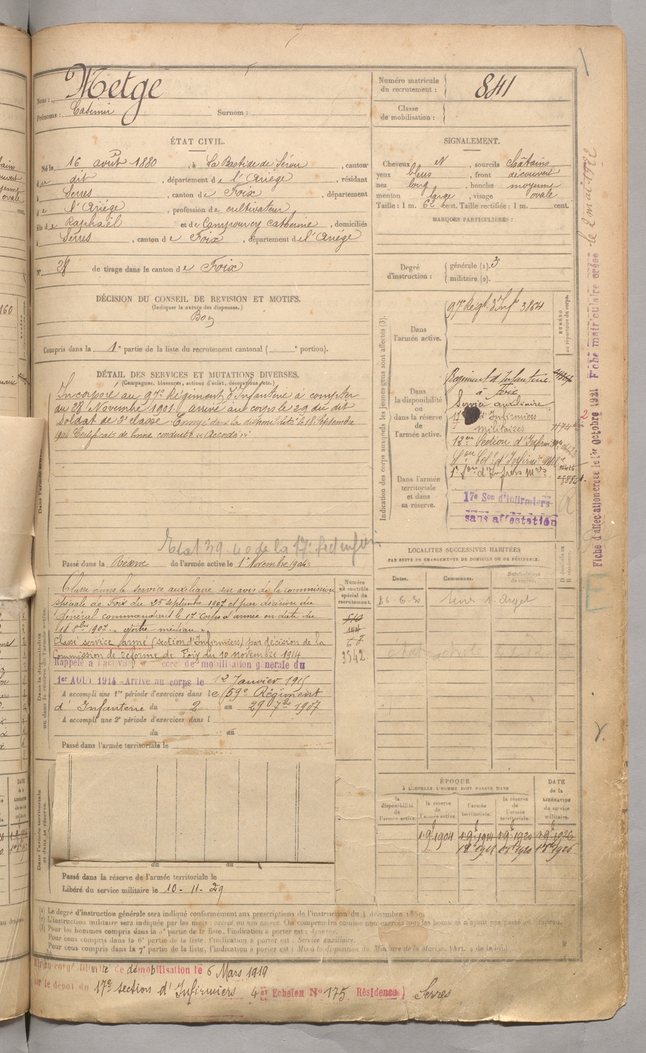 | Metge | Casimir | FOIX | 129 W 3 | 1900 | Bastide-de-Sérou (La) | Serres-sur-Arget | 841 |