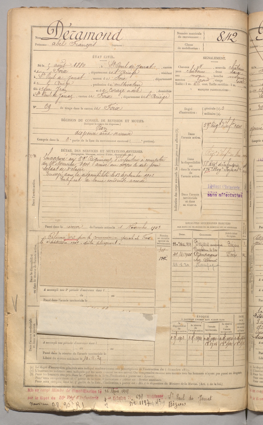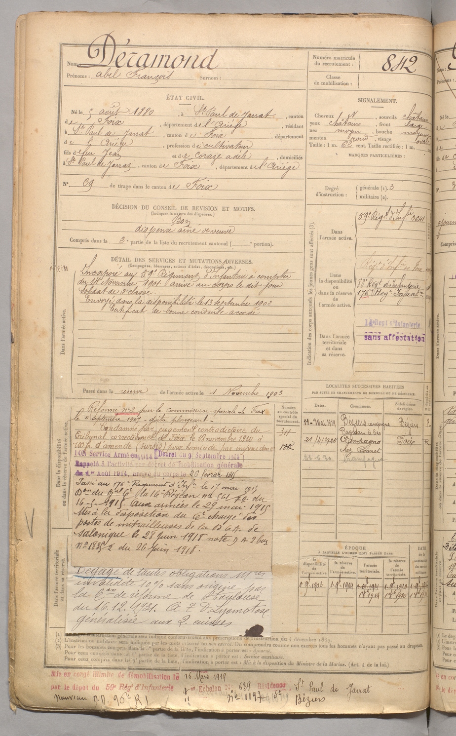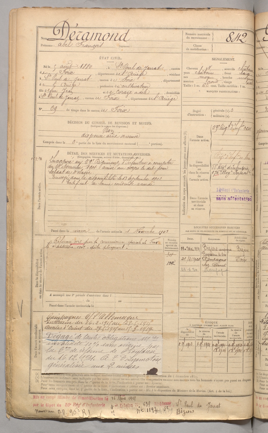 | Déramond | Abel François | FOIX | 129 W 3 | 1900 | Saint-Paul-de-Jarrat | Saint-Paul-de-Jarrat | 842 |
