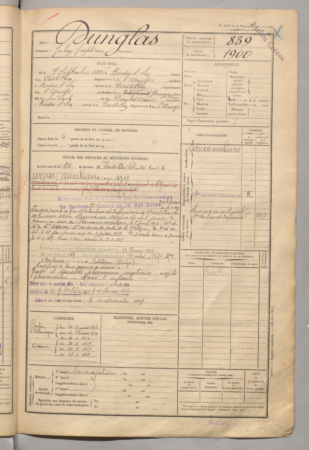 | Dunglas | Julien Joseph Désiré | FOIX | 129 W 5 | 1900 | Bordes-sur-Lez | Bordes-sur-Lez | 839 |