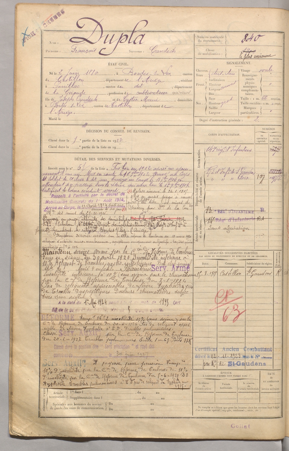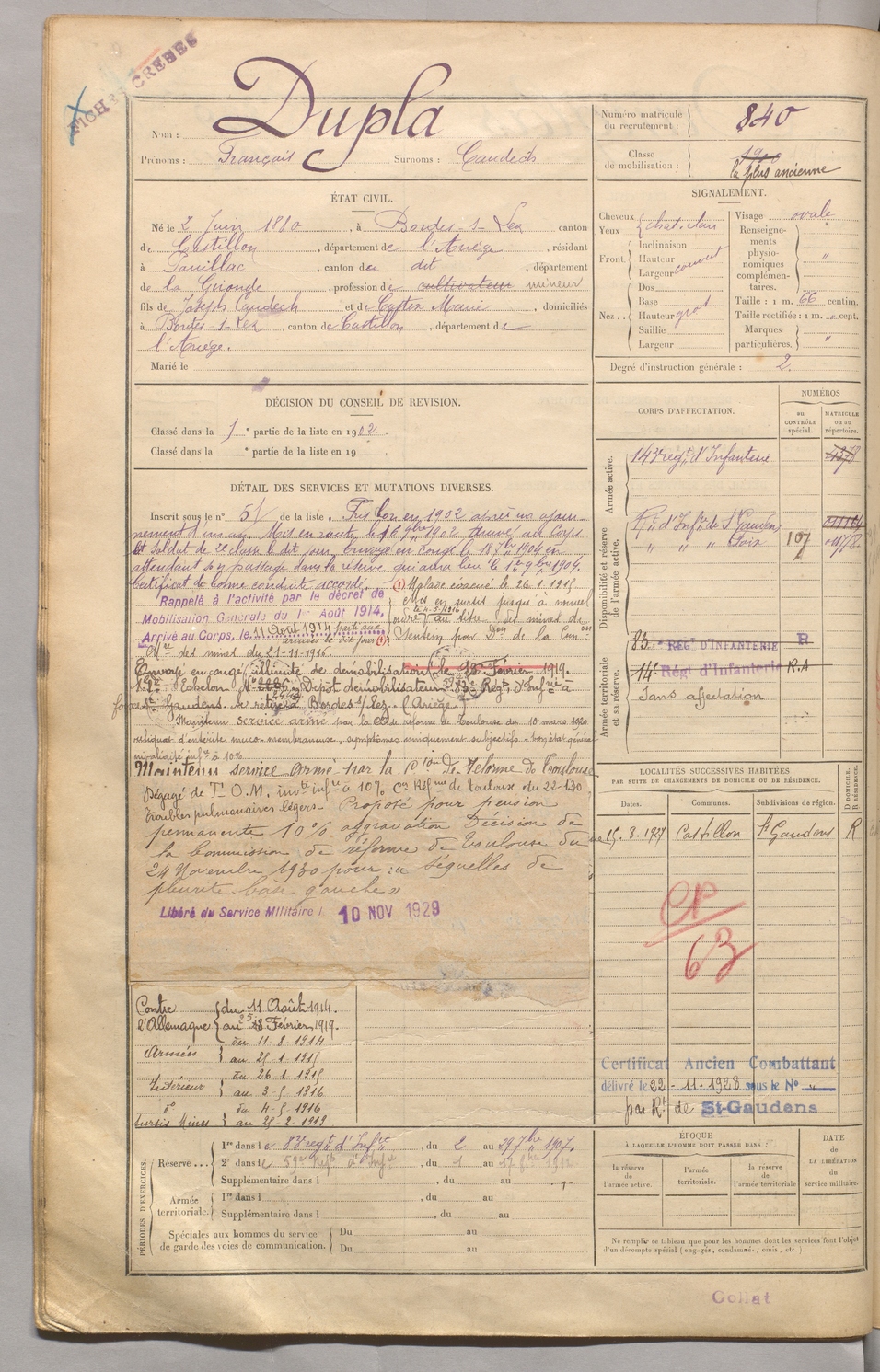 | Dupla | François dit Caudech | FOIX | 129 W 5 | 1900 | Bordes-sur-Lez | Pauillac | 840 |