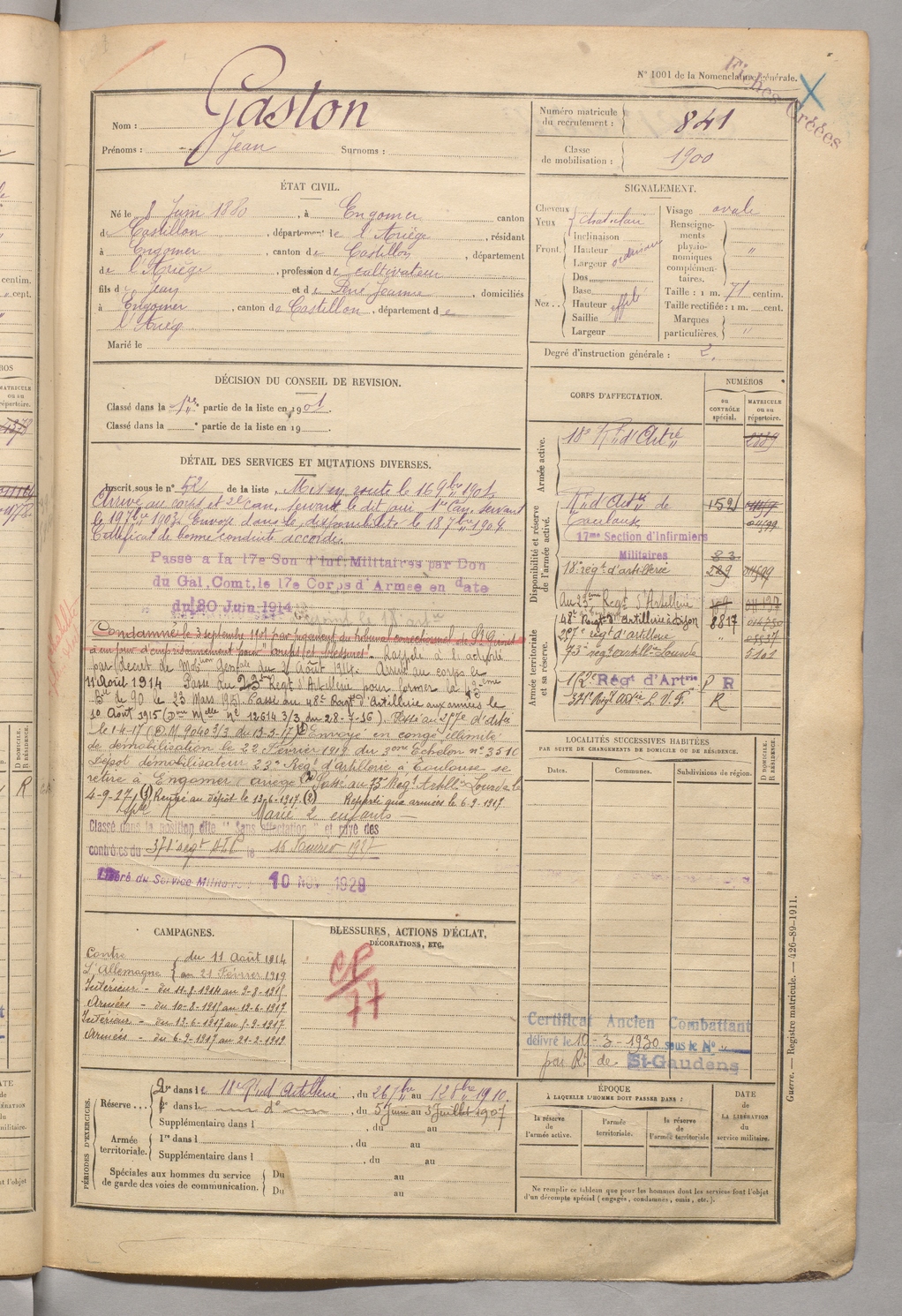 | Gaston | Jean | FOIX | 129 W 5 | 1900 | Engomer | Engomer | 841 |