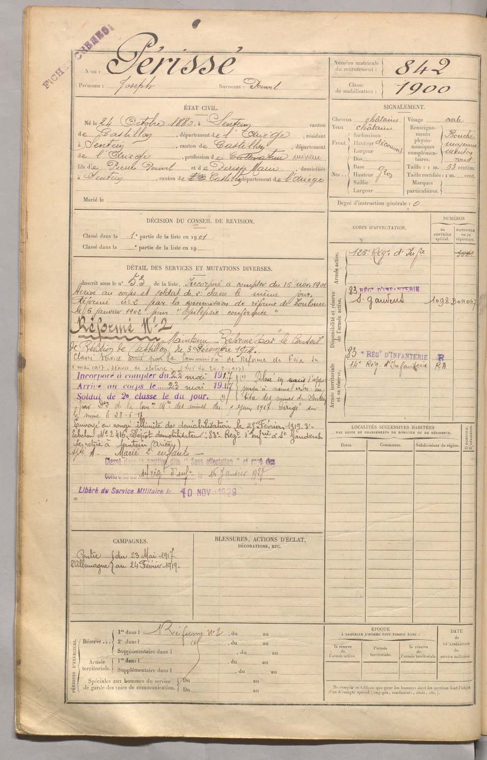 | Périssé | Joseph dit Pouvil | FOIX | 129 W 5 | 1900 | Sentein | Sentein | 842 |