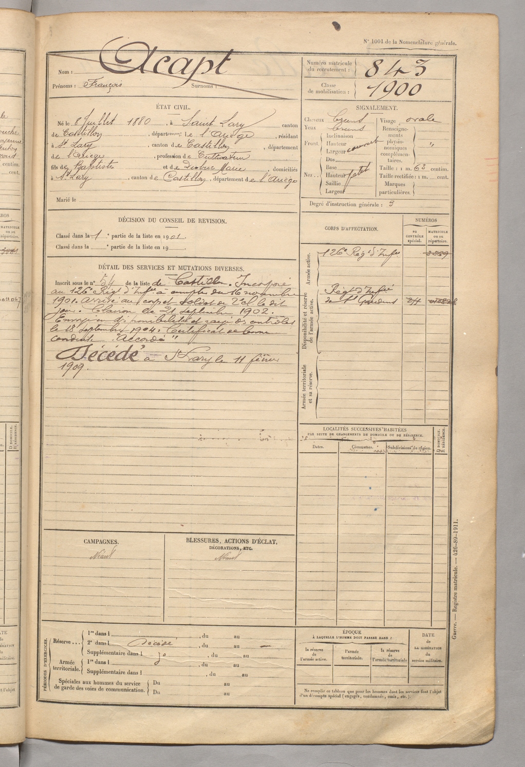| Acapt | François | FOIX | 129 W 5 | 1900 | Saint-Lary | Saint-Lary | 843 |