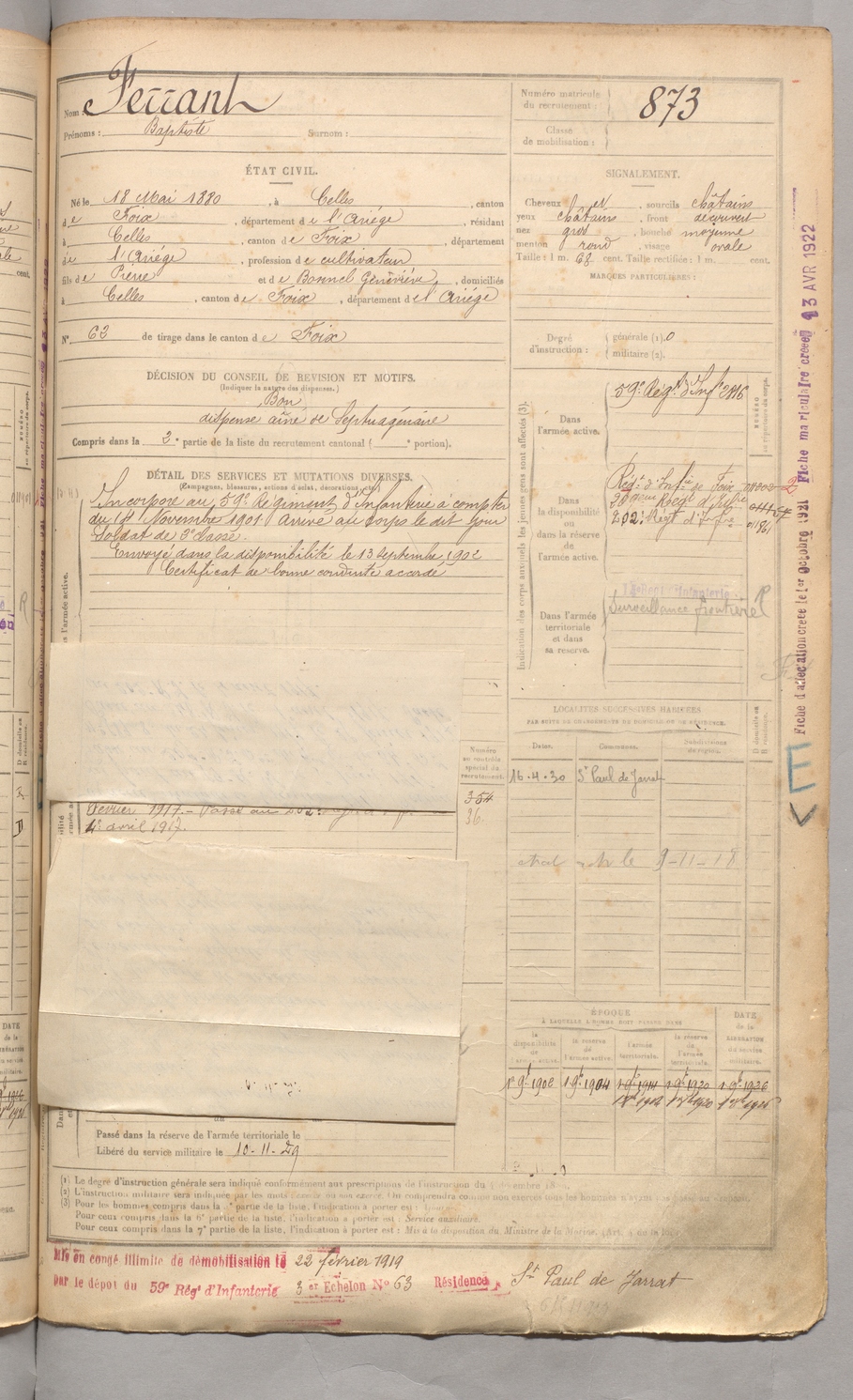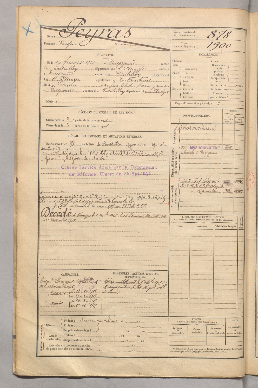 | Peyras | Eugène | FOIX | 129 W 5 | 1900 | Engomer | Engomer | 878 |