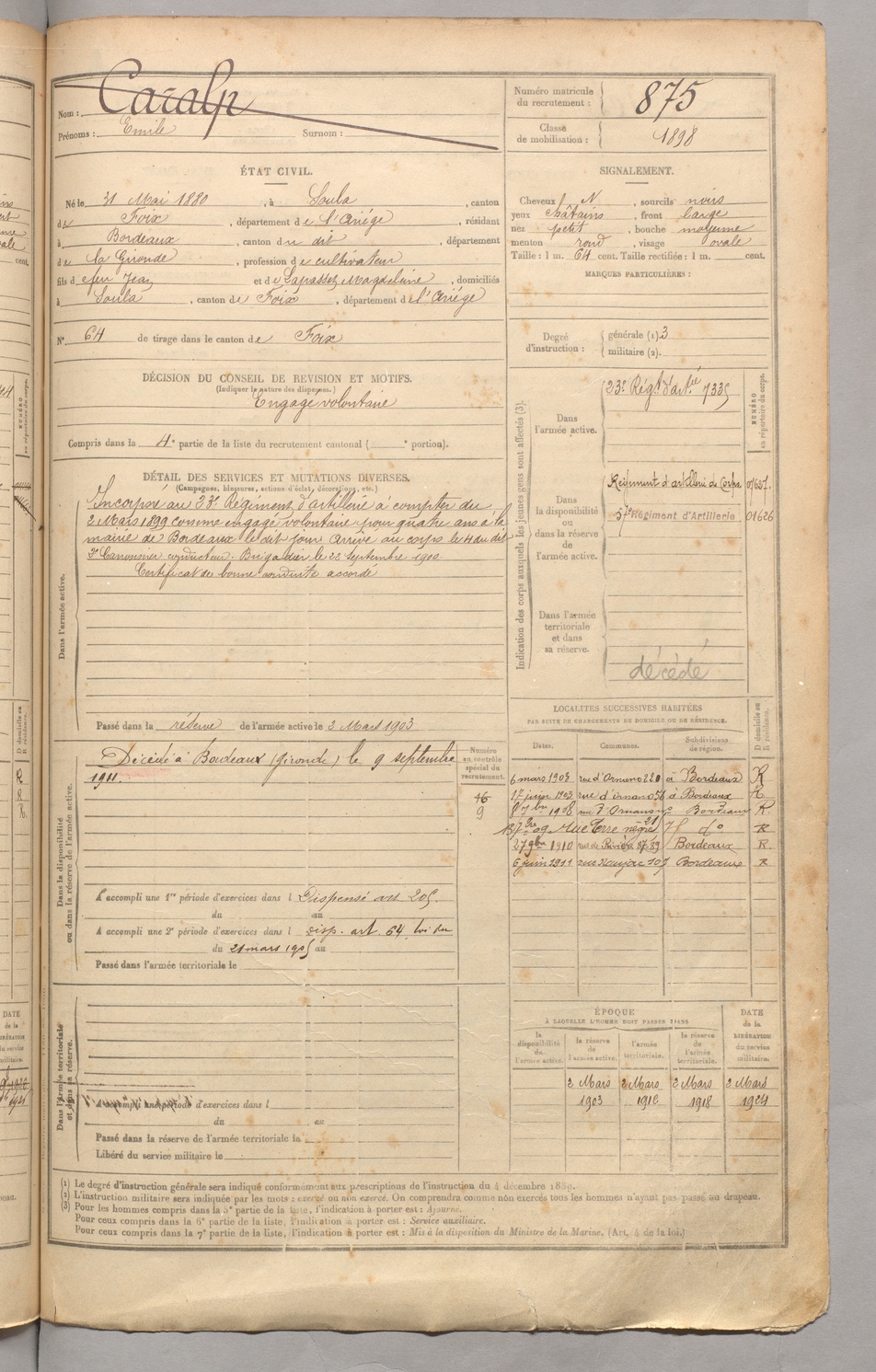 | Caralp | Emile | FOIX | 129 W 3 | 1900 | Soula | Bordeaux | 875 |