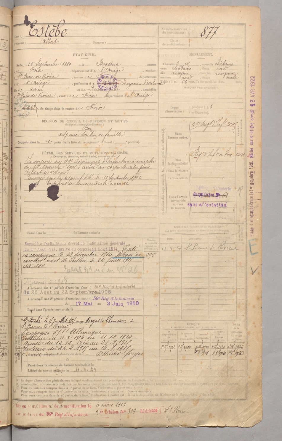 | Estèbe | Albert | FOIX | 129 W 3 | 1900 | Brassac | Saint-Pierre-de-Rivière | 877 |