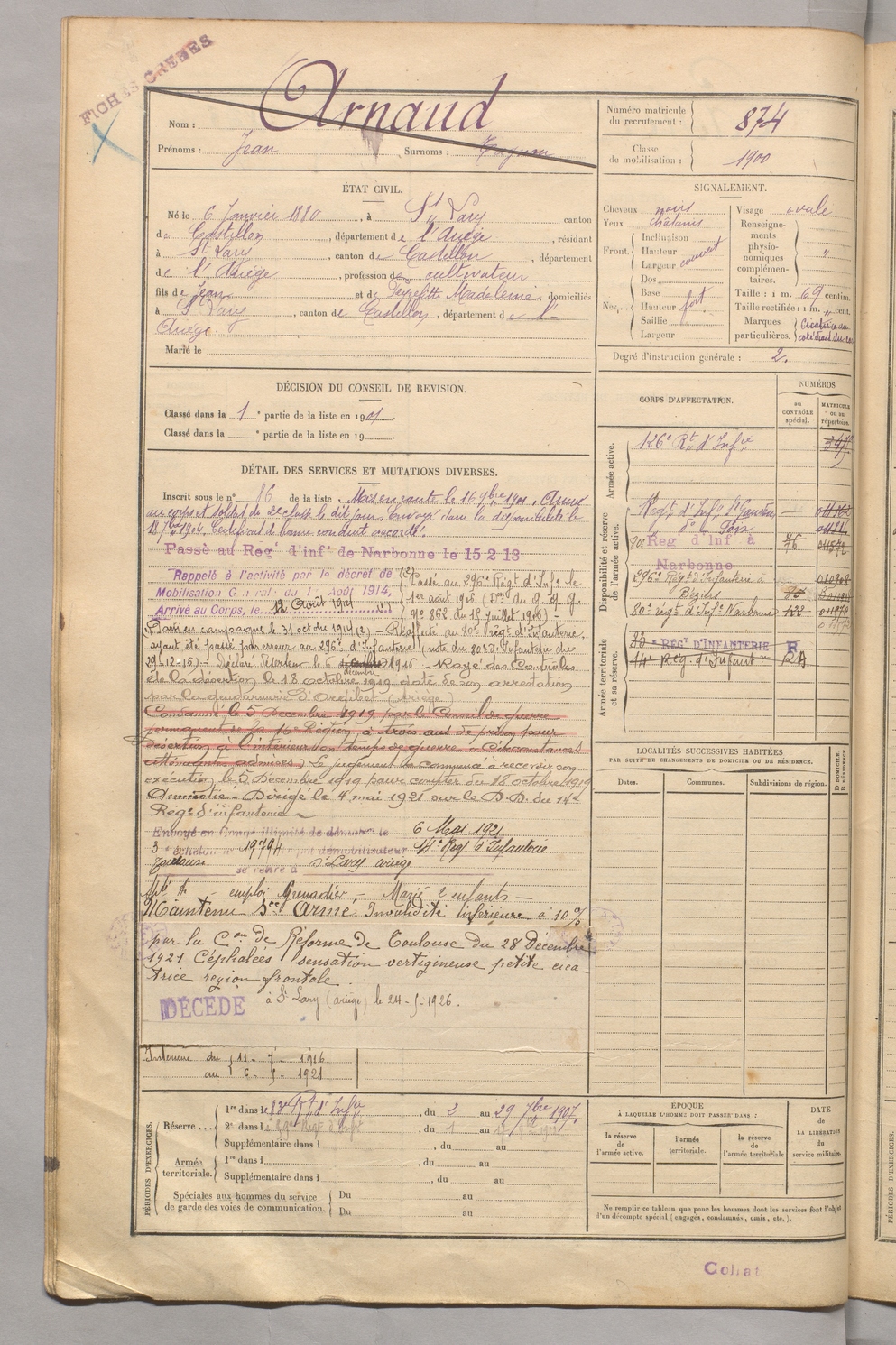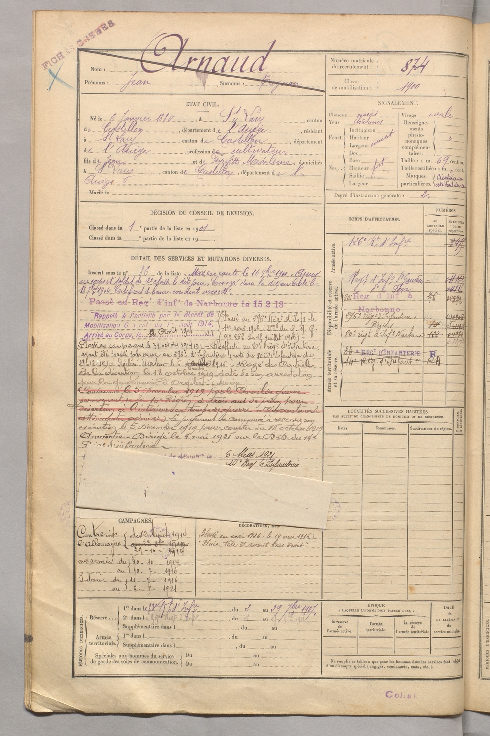| Arnaud | Jean dit Tagnon | FOIX | 129 W 5 | 1900 | Saint-Lary | Saint-Lary | 874 |