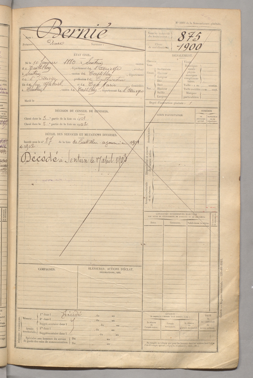 | Bernié | Pierre | FOIX | 129 W 5 | 1900 | Sentein | Sentein | 875 |