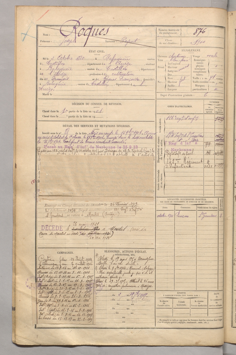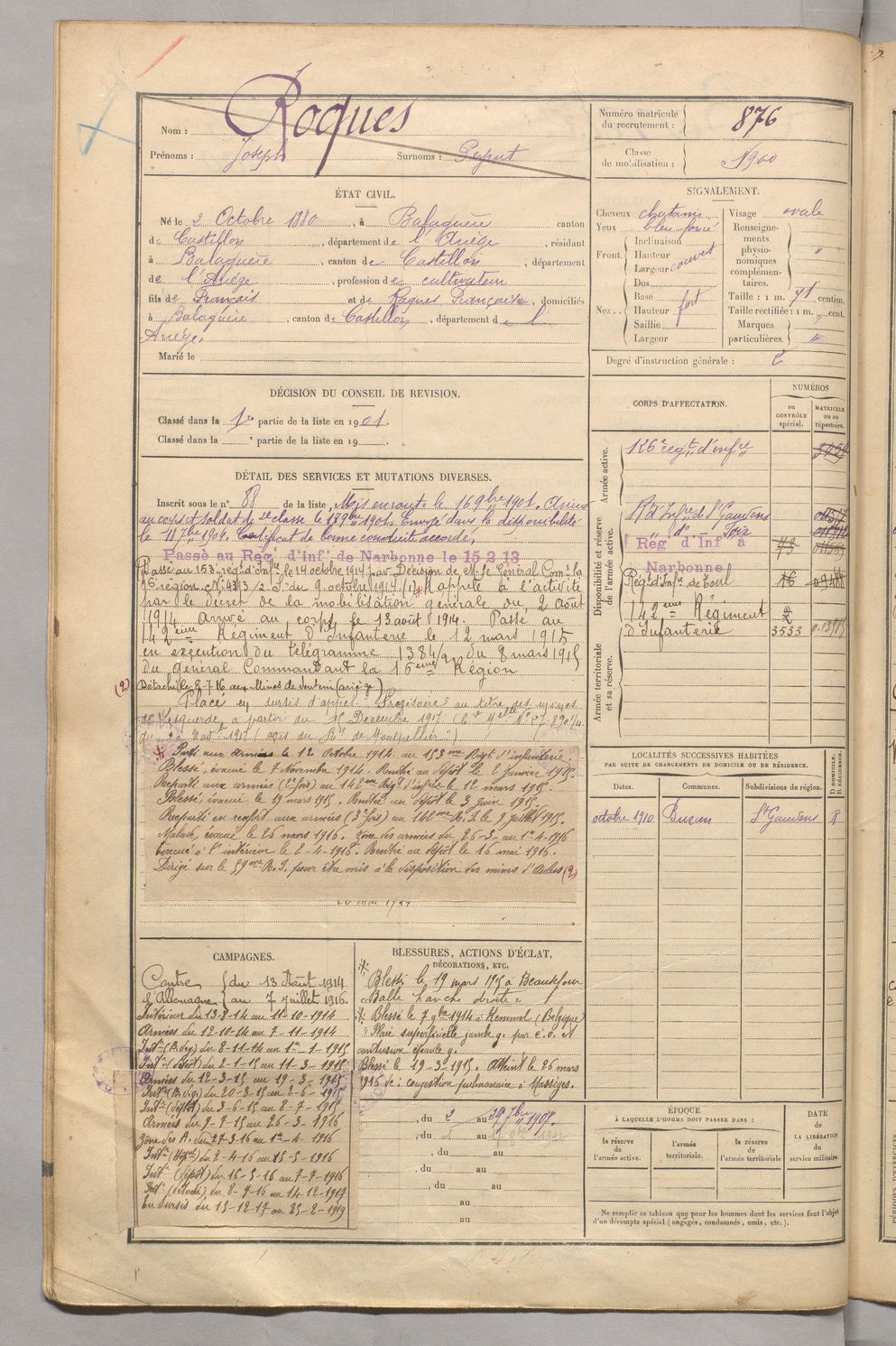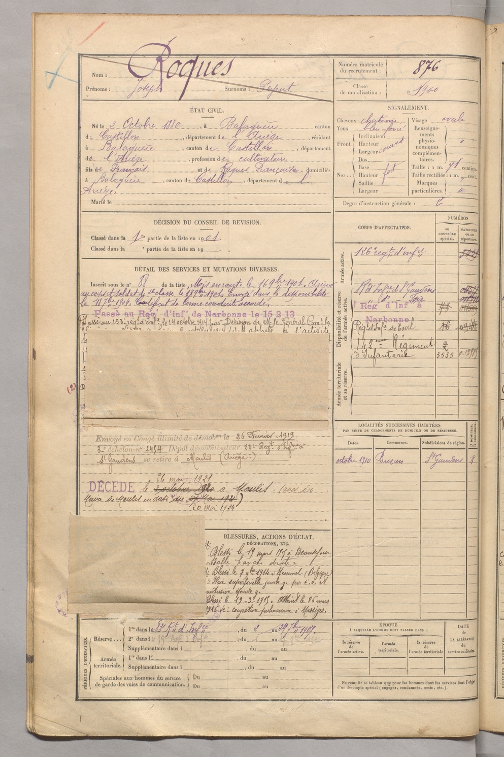 | Roques | Joseph dit Peyrut | FOIX | 129 W 5 | 1900 | Balaguères | Balaguères | 876 |