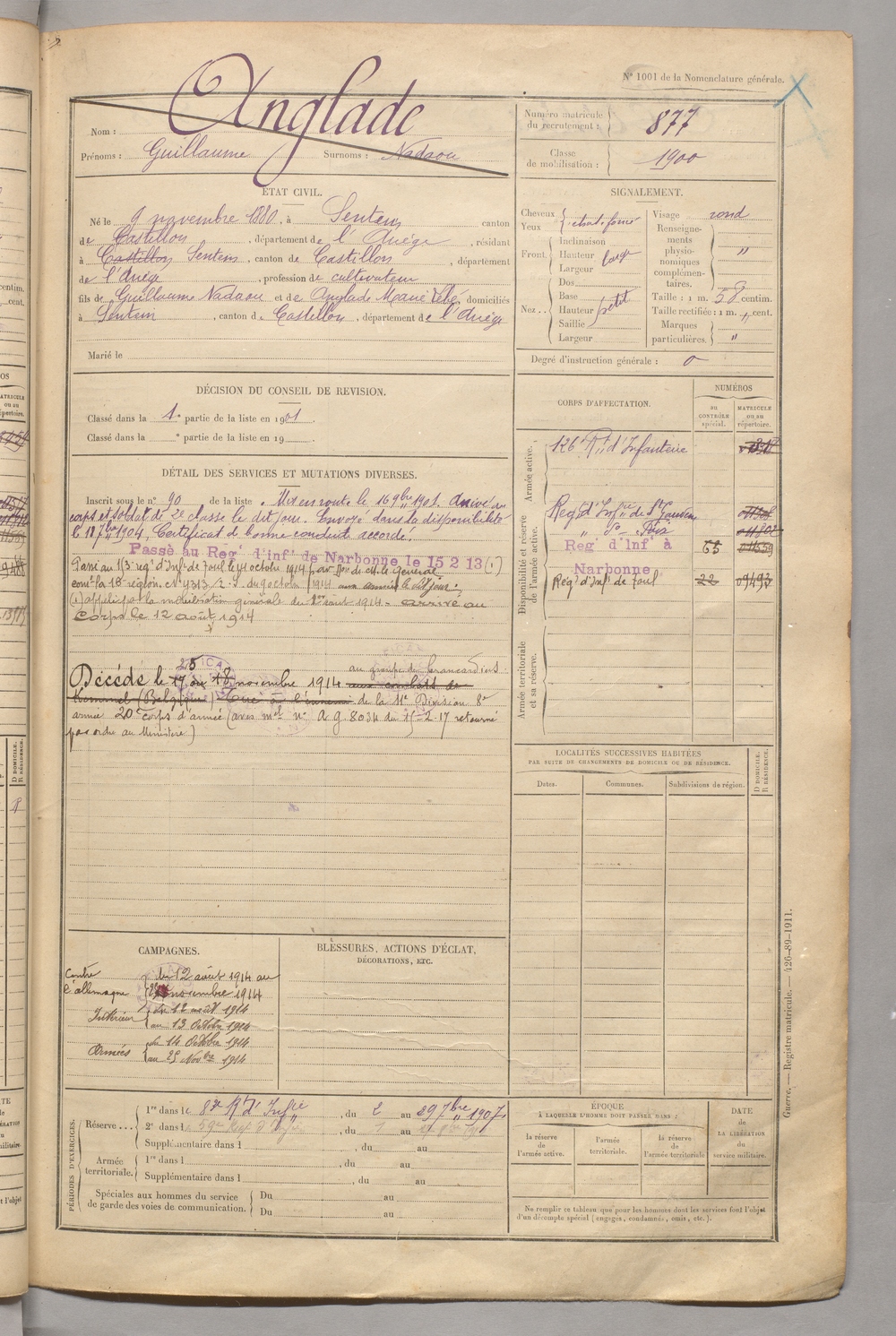 | Anglade | Guillaume dit Nadaou | FOIX | 129 W 5 | 1900 | Sentein | Sentein | 877 |